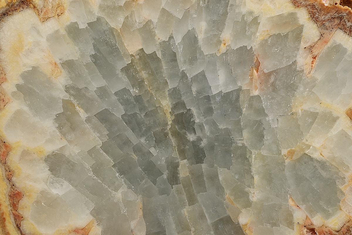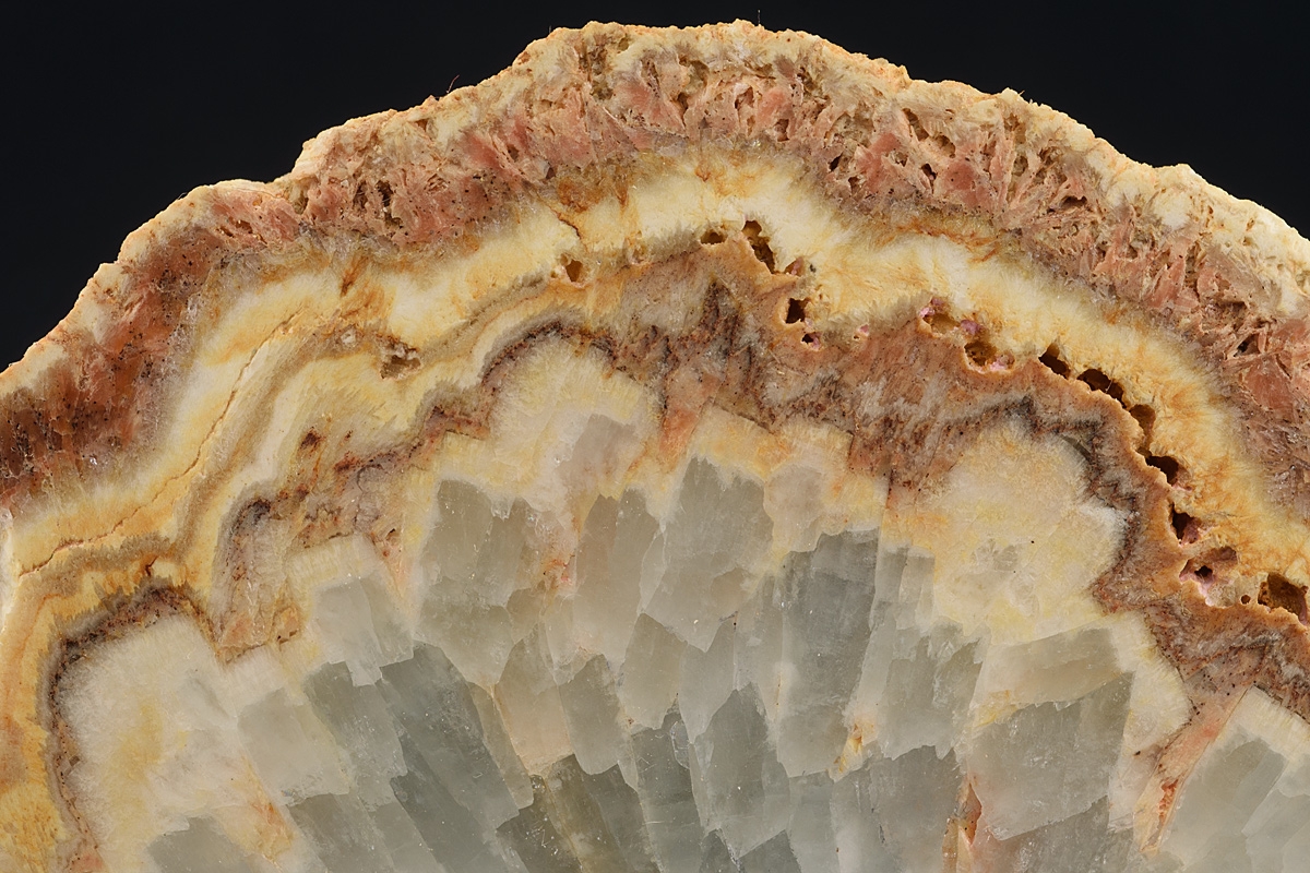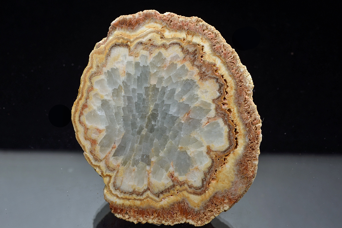 Near complete circular section of barytes with a blocky crystallised interior enclosed within concentric bands of cream and brown botryoidal barytes. Attractive.