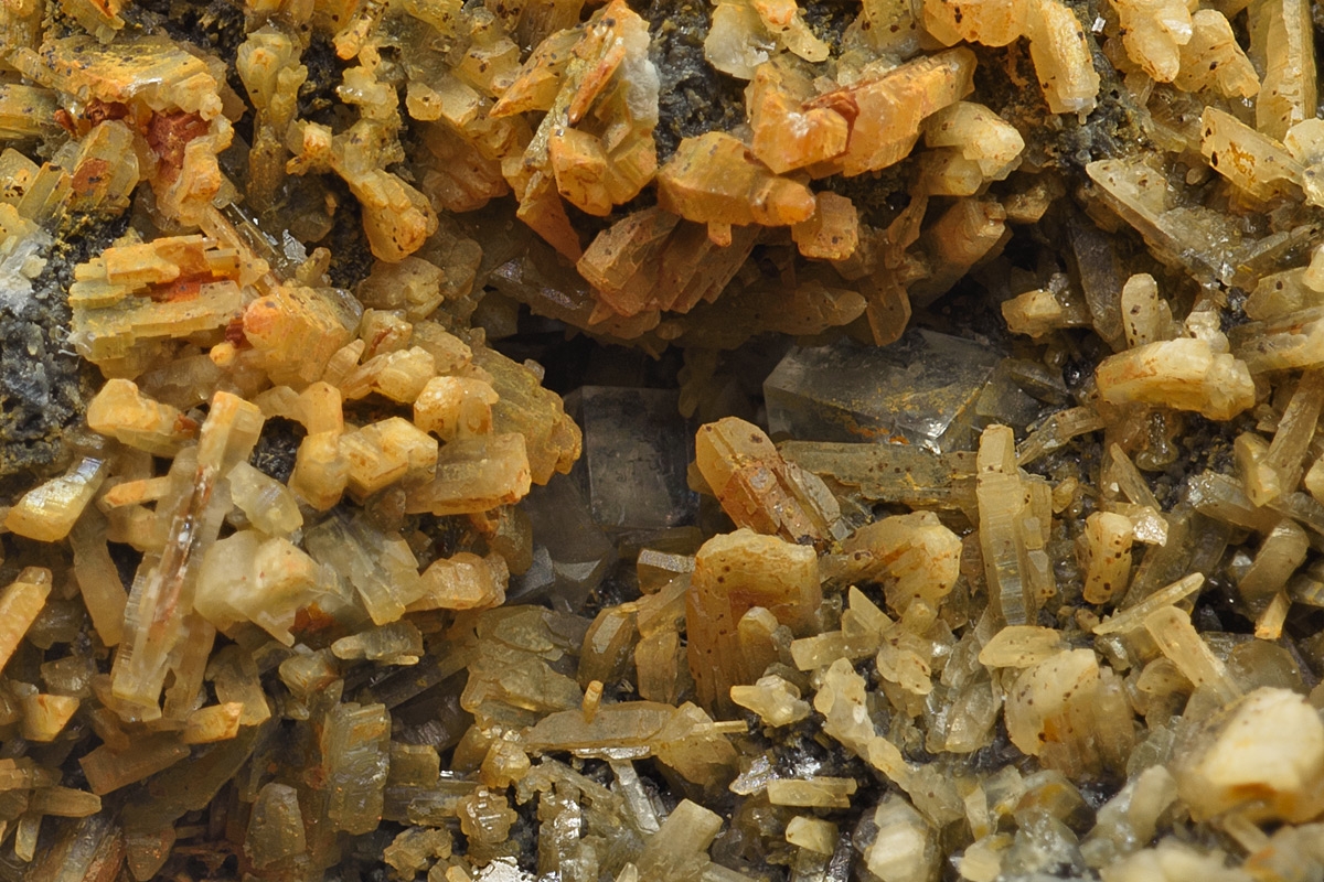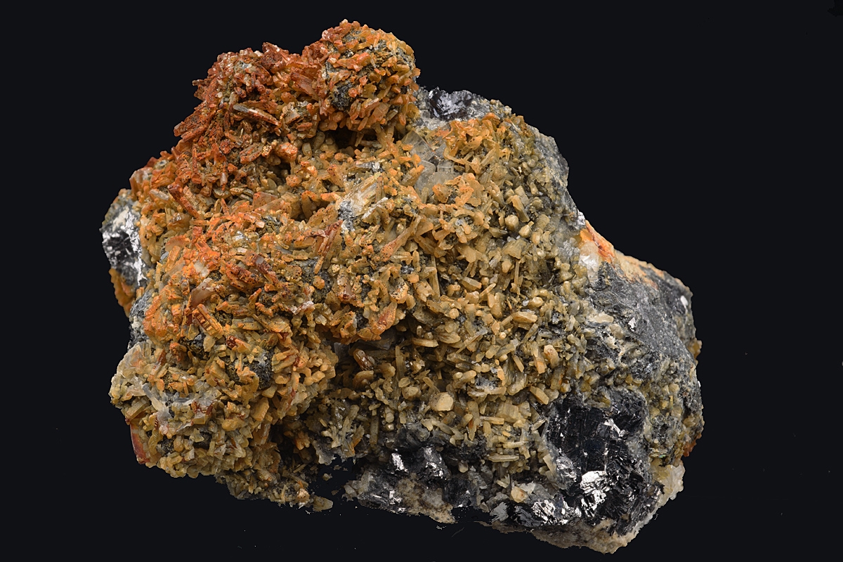 Galena, mostly crystallised, richly coated with light to dark brown coloured cerussite crystals. The specimen is a 'floater', the underside displaying small fluorite and galena crystals. Ex. Alan Wardman collection