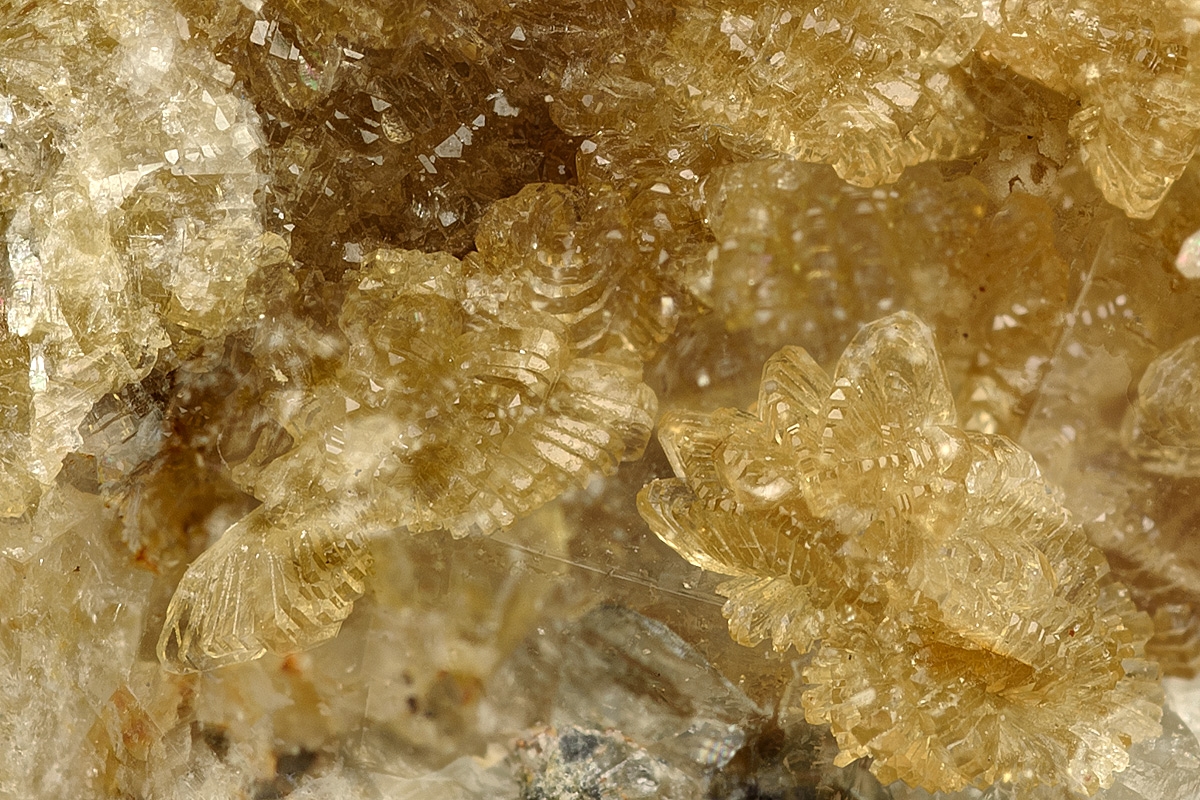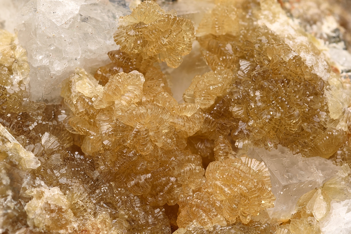 Sparkling crystals of straw coloured hemimorphite pleasingly formed over fluorite