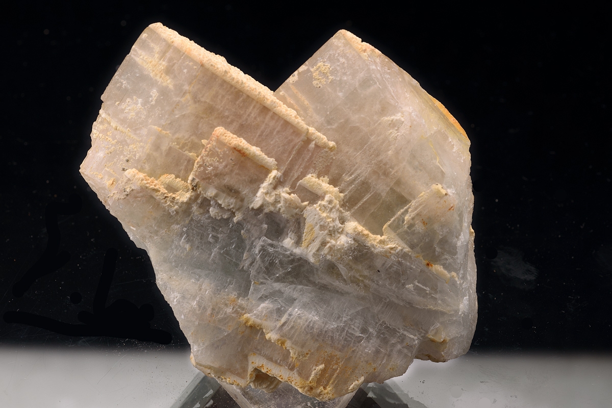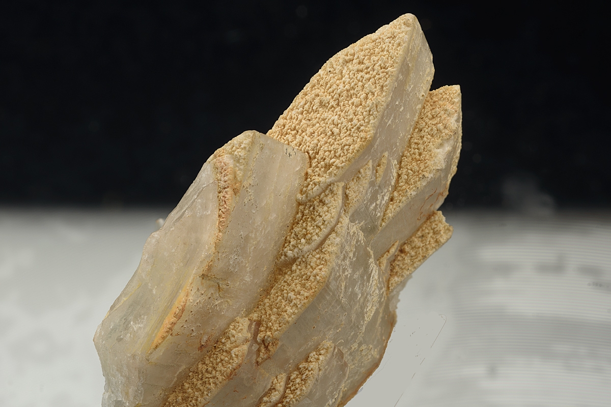 Barite is abundant in Derbyshire usually in massive, coxscomb or stalactitic form. Large crystals are rare, the area around Hazard mine being the only location to produce them. This is a good example from the mine composed of a narrow spray of barite crystals grey to pale blue in colour and coated to one side by later cream coloured barite.