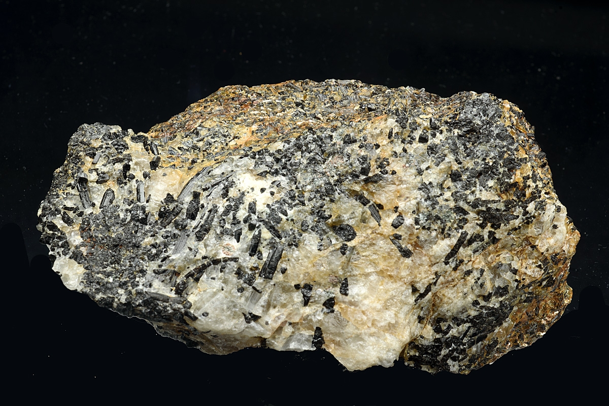 Ground mass hosting infdividual lustrous black Schorl crystals up to 10mm in length associated with a little muscovite mica formed either side and penetratring an area of white quartz. Unusual piece