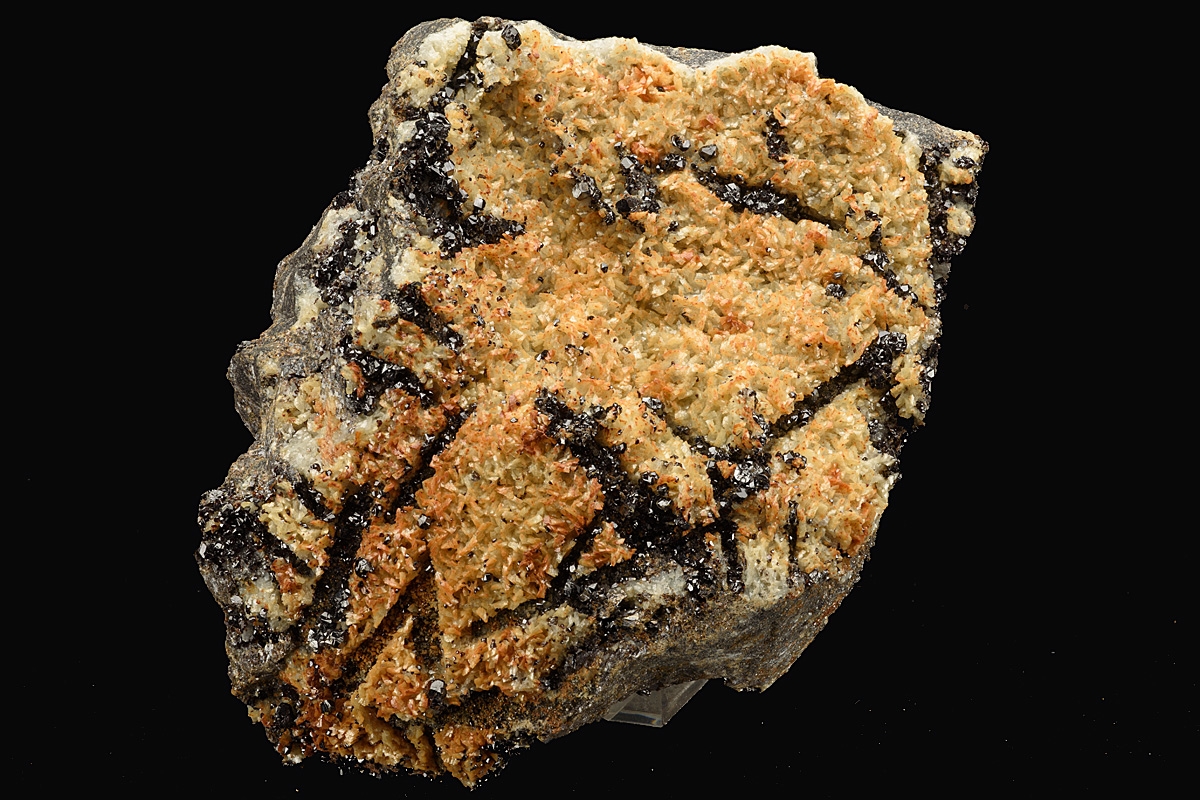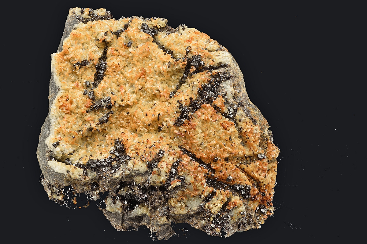 Unusual form of sphalerite crystallisation. A possible explanation for its appearance is that the sphalerite seems to have crystallised in the voids left by dissolved out barytes crystals within a bed of previously formed siderite.