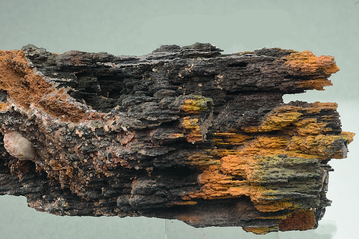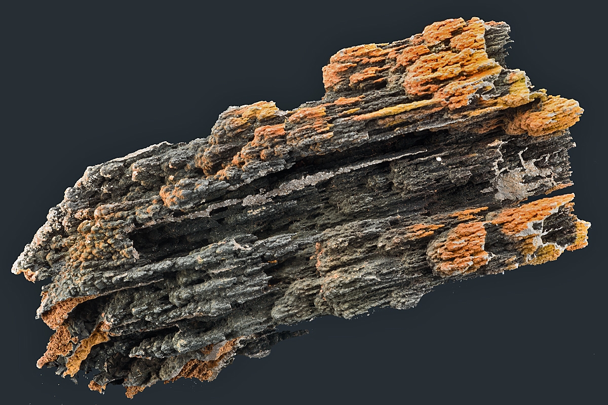 Strangely attractive goethite specimen from the Forest of Dean. Called locally 'Brush' iron-ore it shows a distinctive linear form with an orange/matt-black colouration.