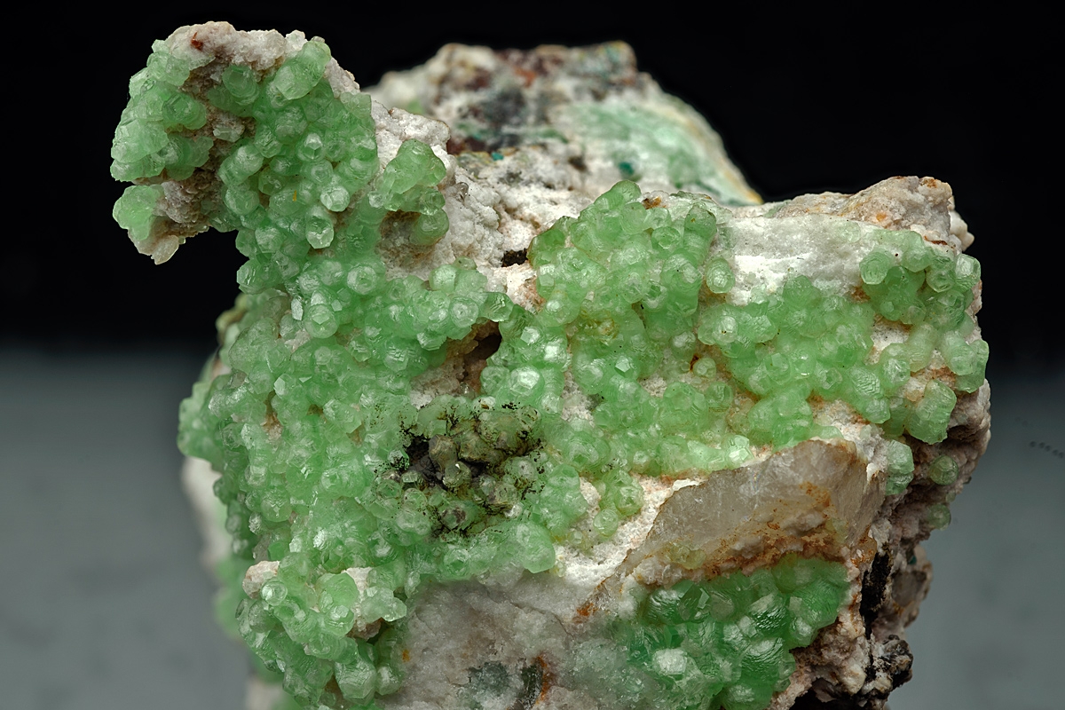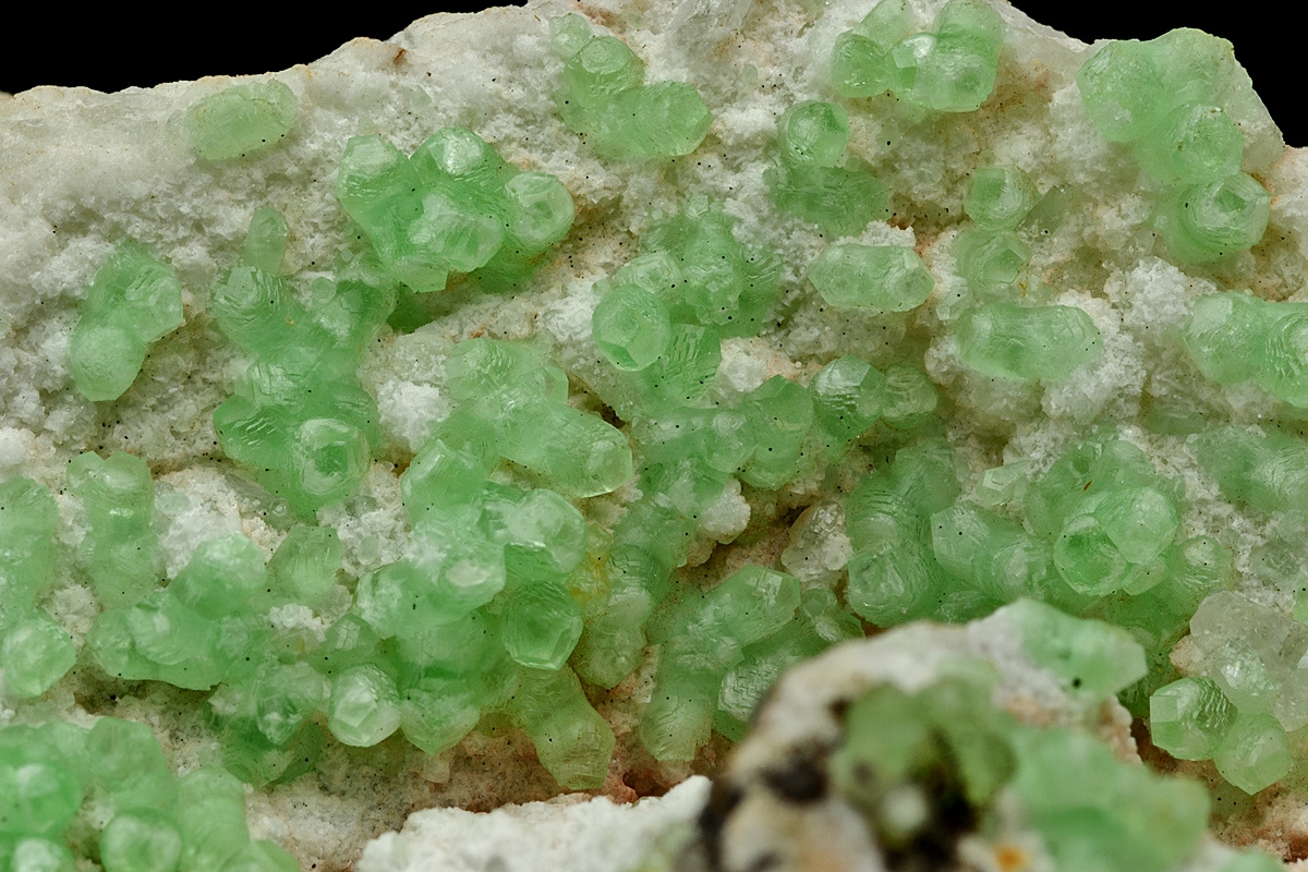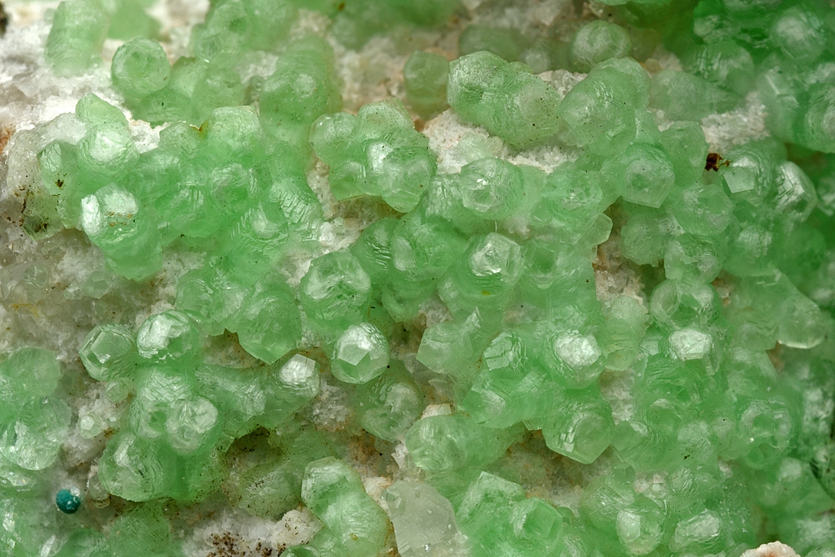 Individual smithsonite crystals of a vibrant pastel green, richly formed over a contrasting white bed of dolomite. Choice Tsumeb specimen Ex. John Sheraton collection.