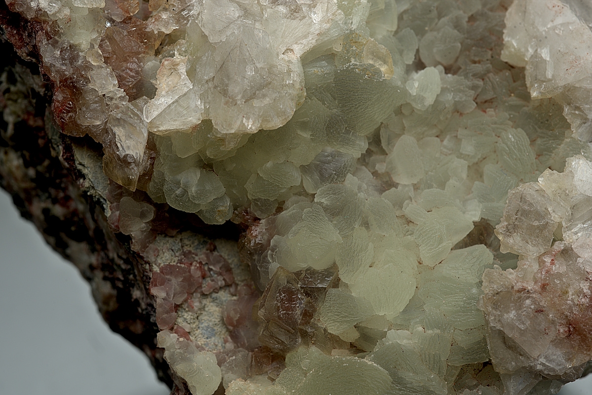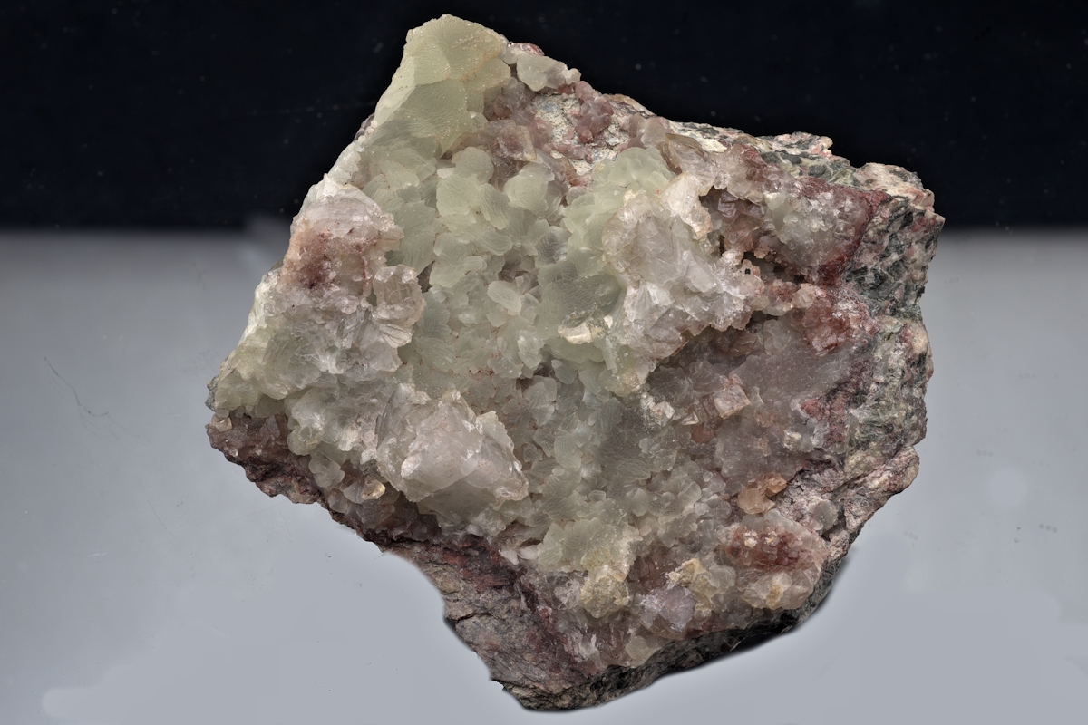 Cavity formed across most of the specimen's display face of grey-green prehnite, well crystallised with just a couple of small contacted areas.