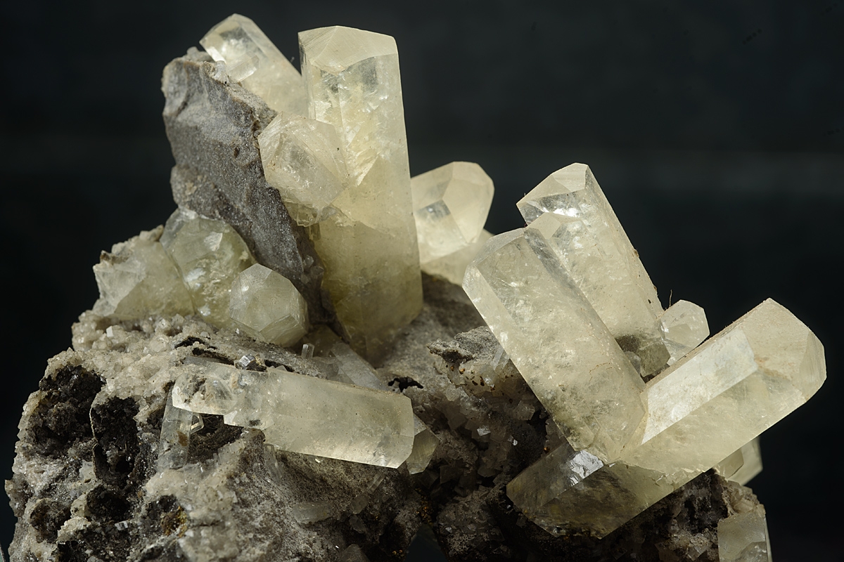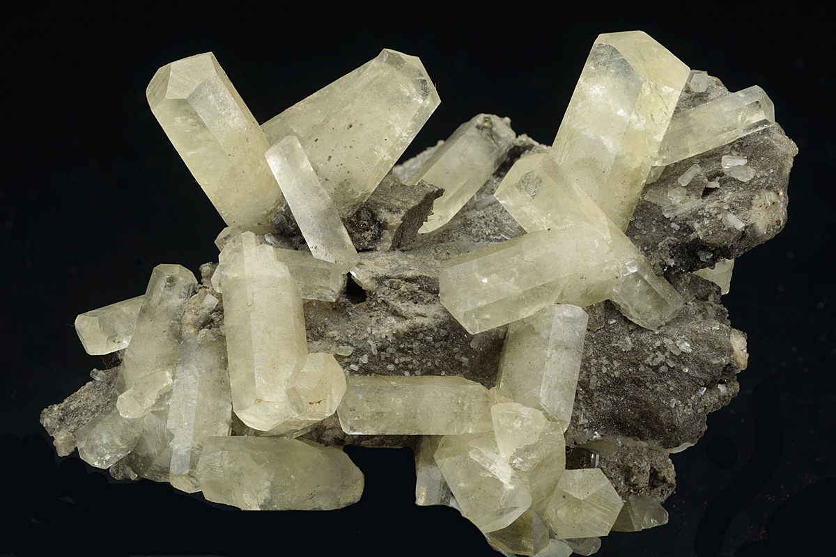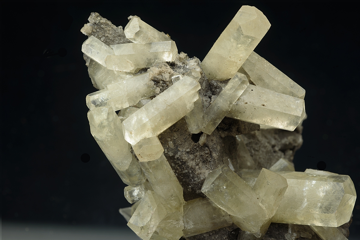 Choice Calcite specimen ex. my collection. Rich intertwinned group of translucent lustrous calcite crystals (to 24mm long) some double terminated creating a very aesthetic specimen.