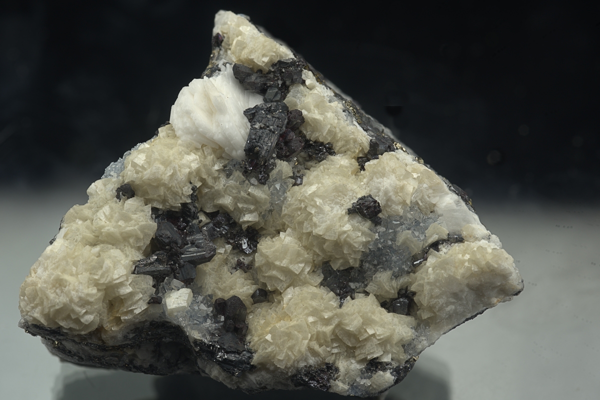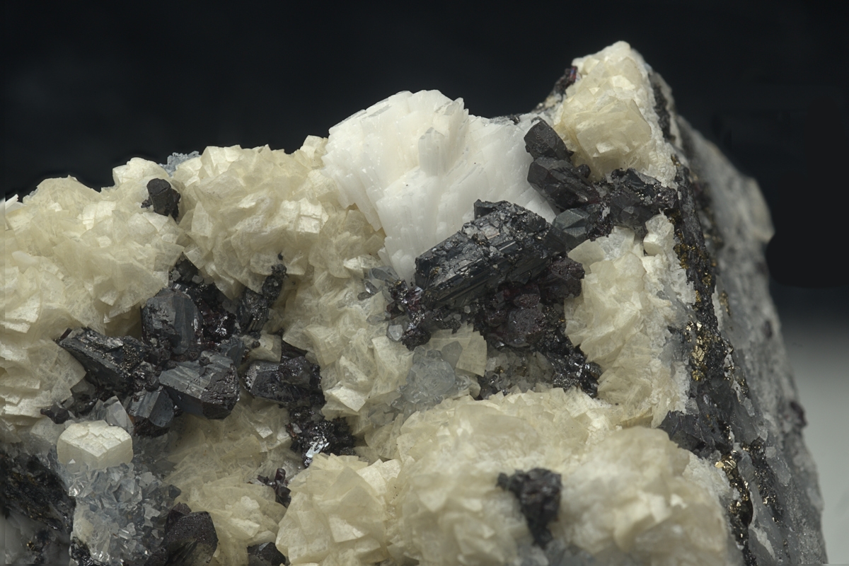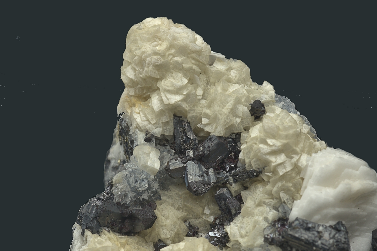 Well formed and lustrous crystals of pyragyrite and polybasite set off against a cream dolomite matrix. Ex.John Sheraton collection