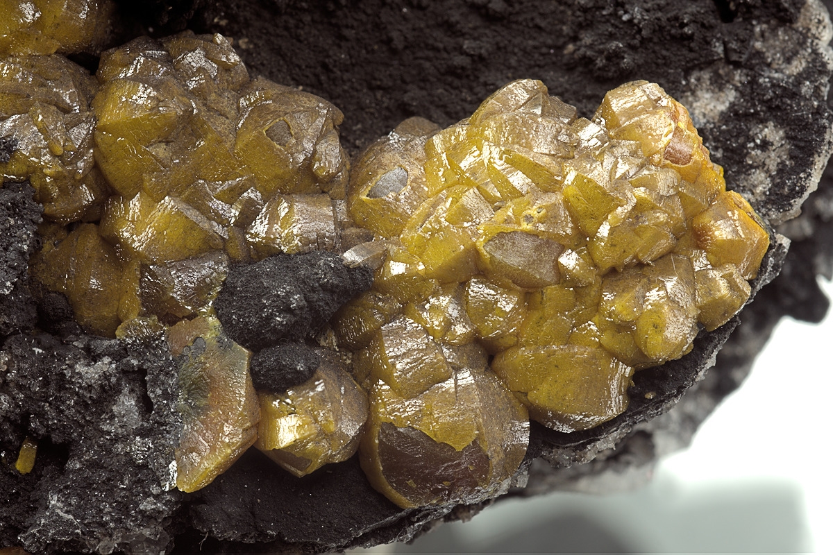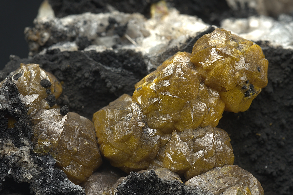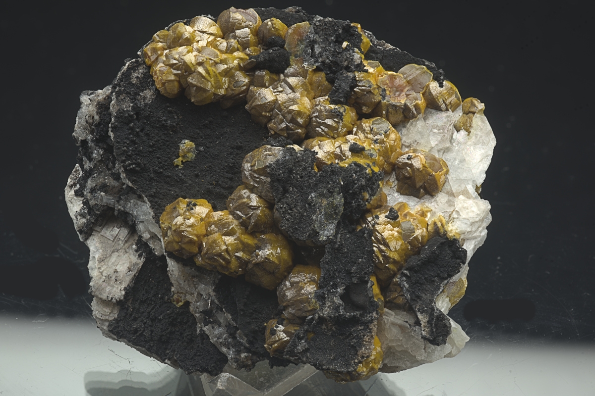 Orange aggregated Campylite crystals of classic 'Barrel' shaped habit formed over barite with accompanying black manganese oxide. Ex. David Walker-Barker collection.