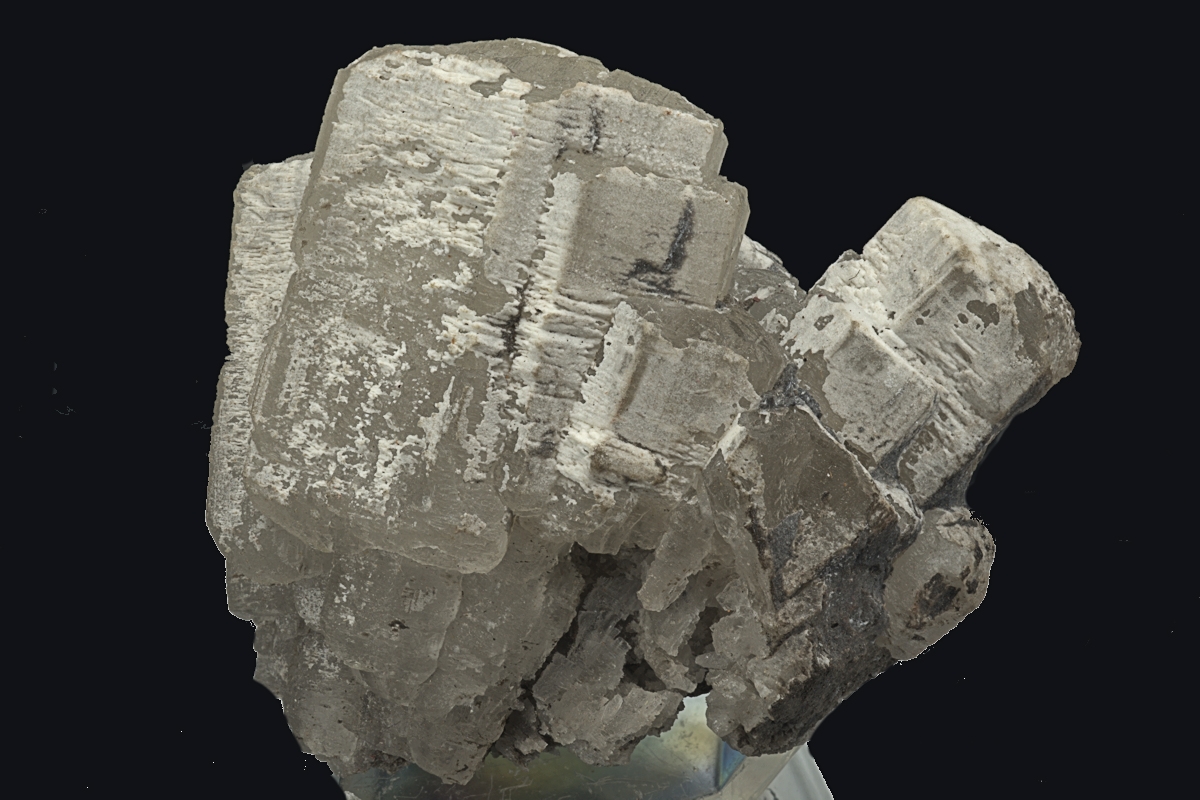 Matrixless specimen of witherite consisting of blocky stepped pseudo-hexagonal crystals of good habit with a thin surface alteration to barite typical of specimens from Nentsberry Haggs mine. Ex. Peter Briscoe collection