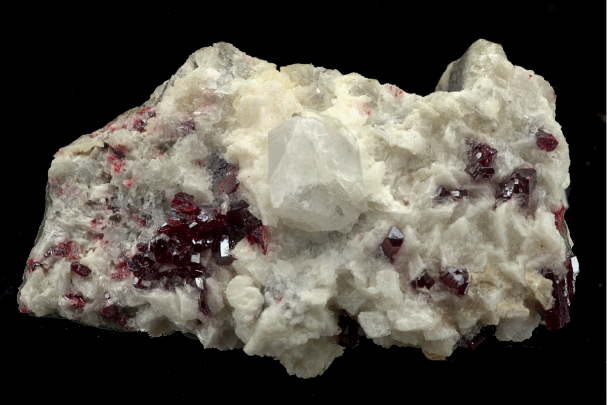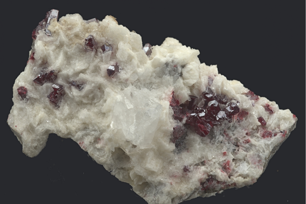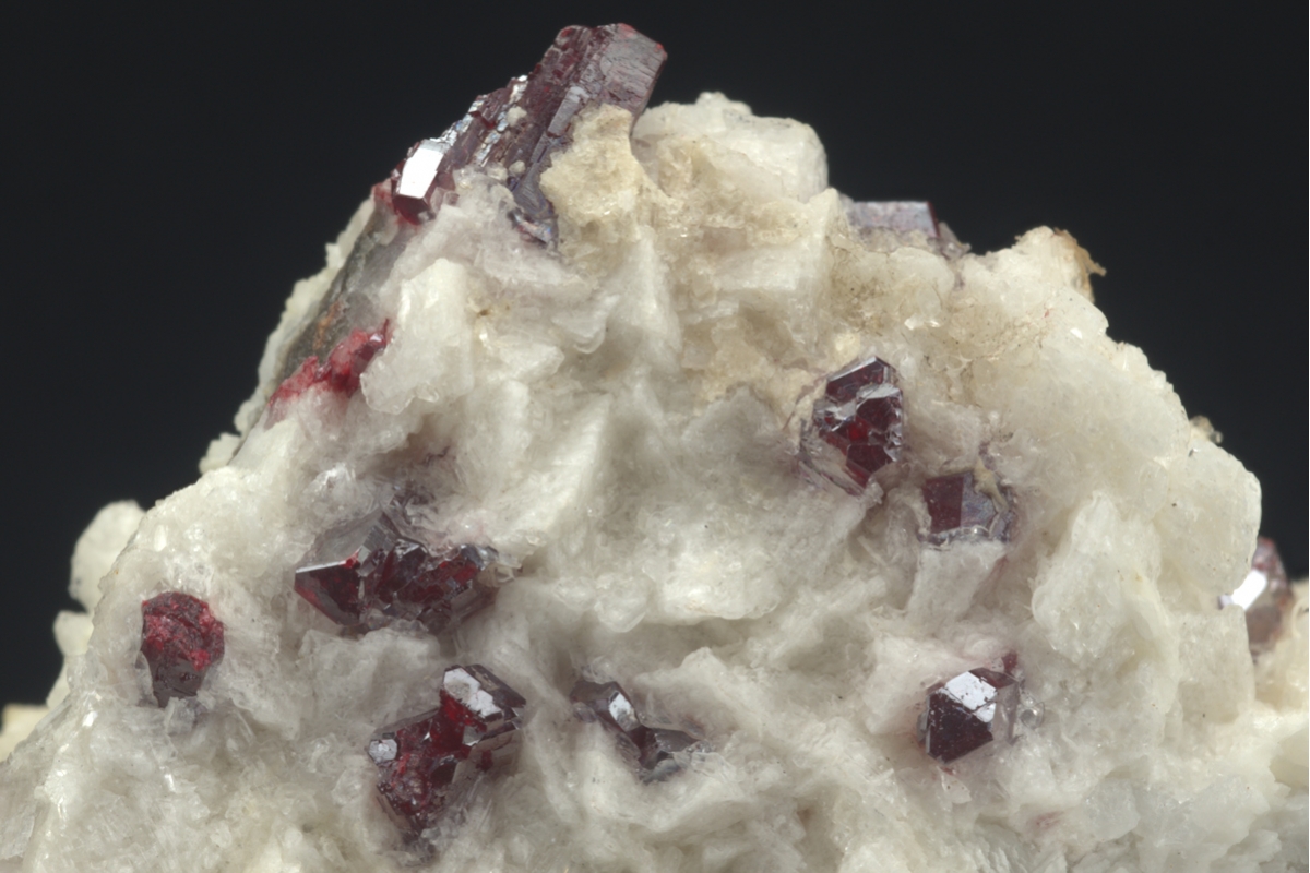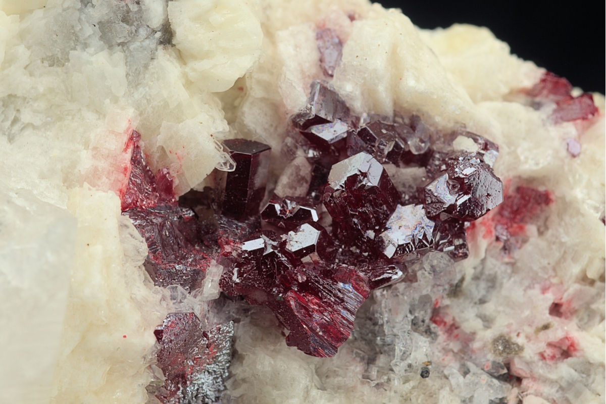 Rich emplacement of well formed sparkling deep red cinnabar crystals on a bed of dolomite.