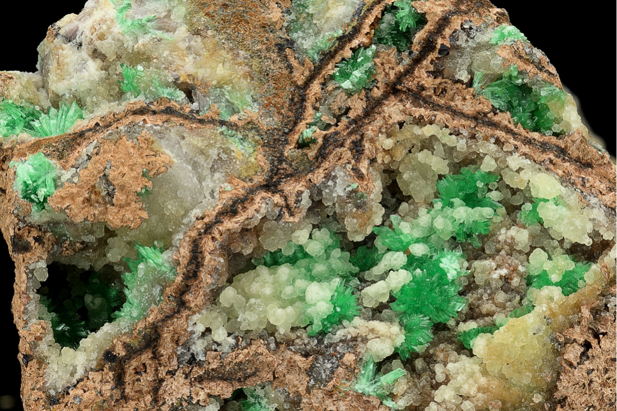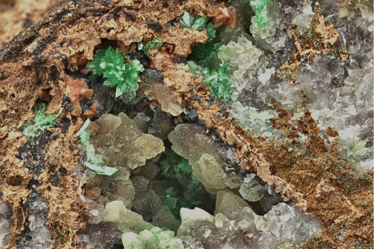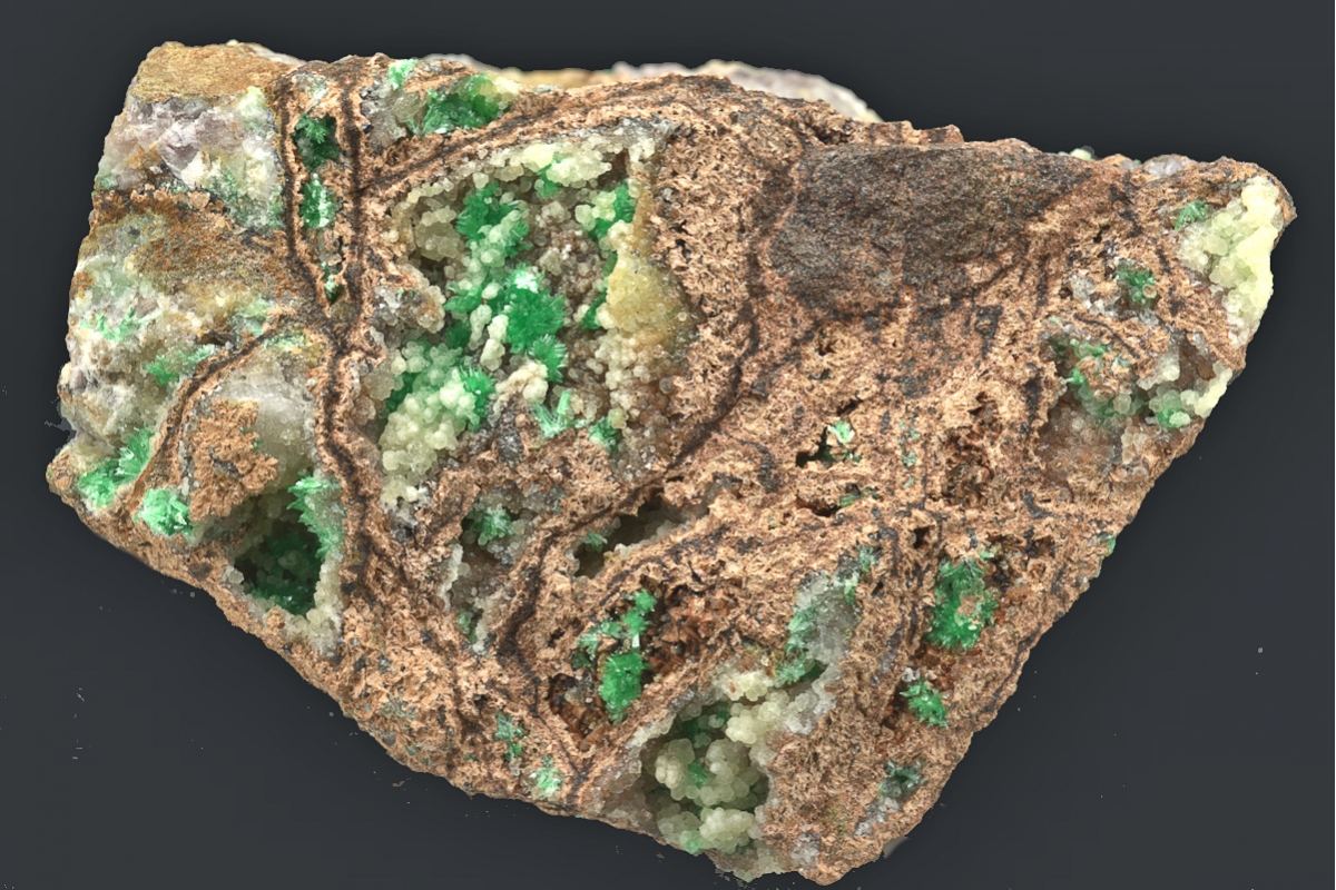 Triangular shaped specimen hosting cavities of various sizes, the largest 13x13mm, sprinkled with lustrous bright emerald-green clusters of bladed Annabergite crystals associated with a little calcite.