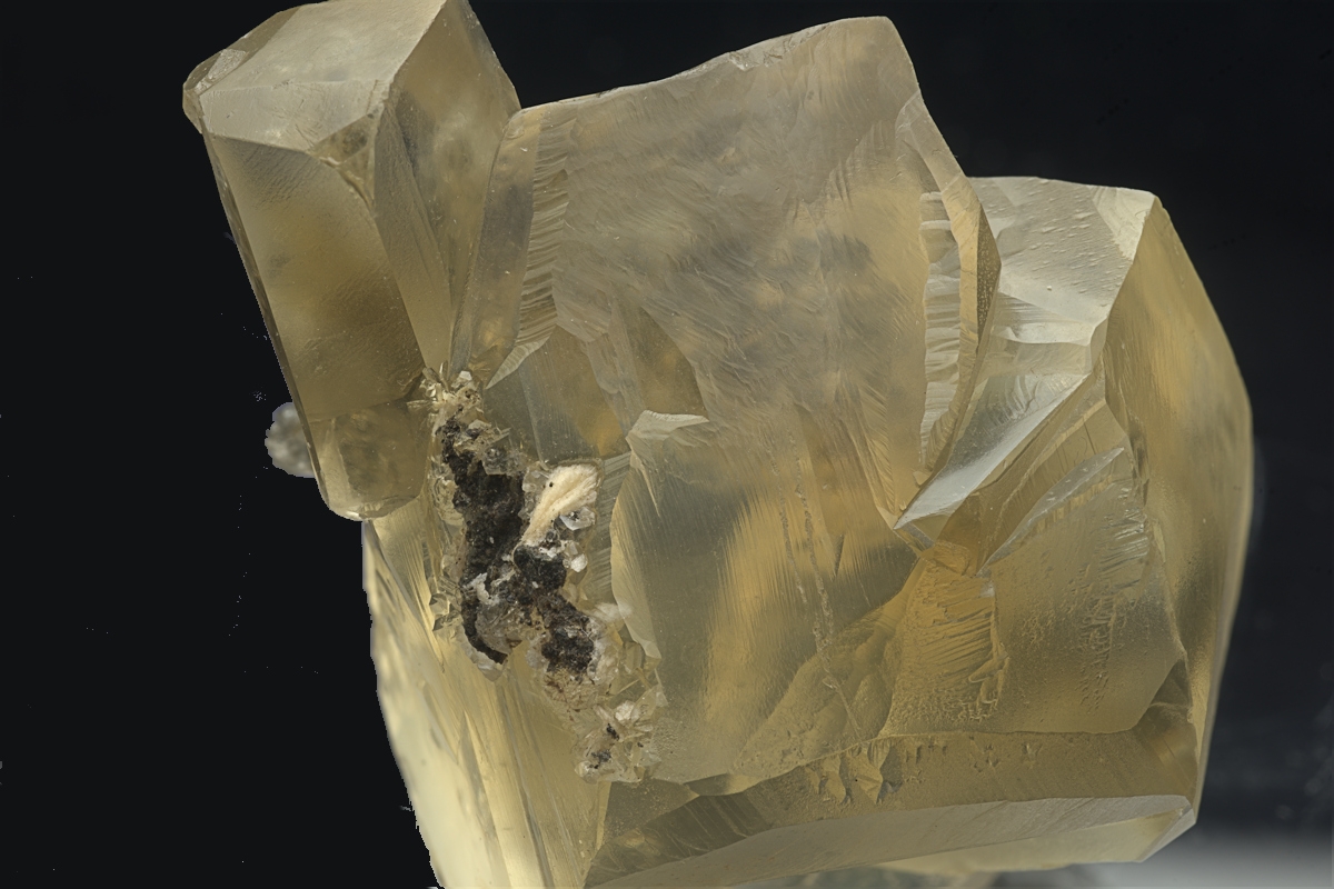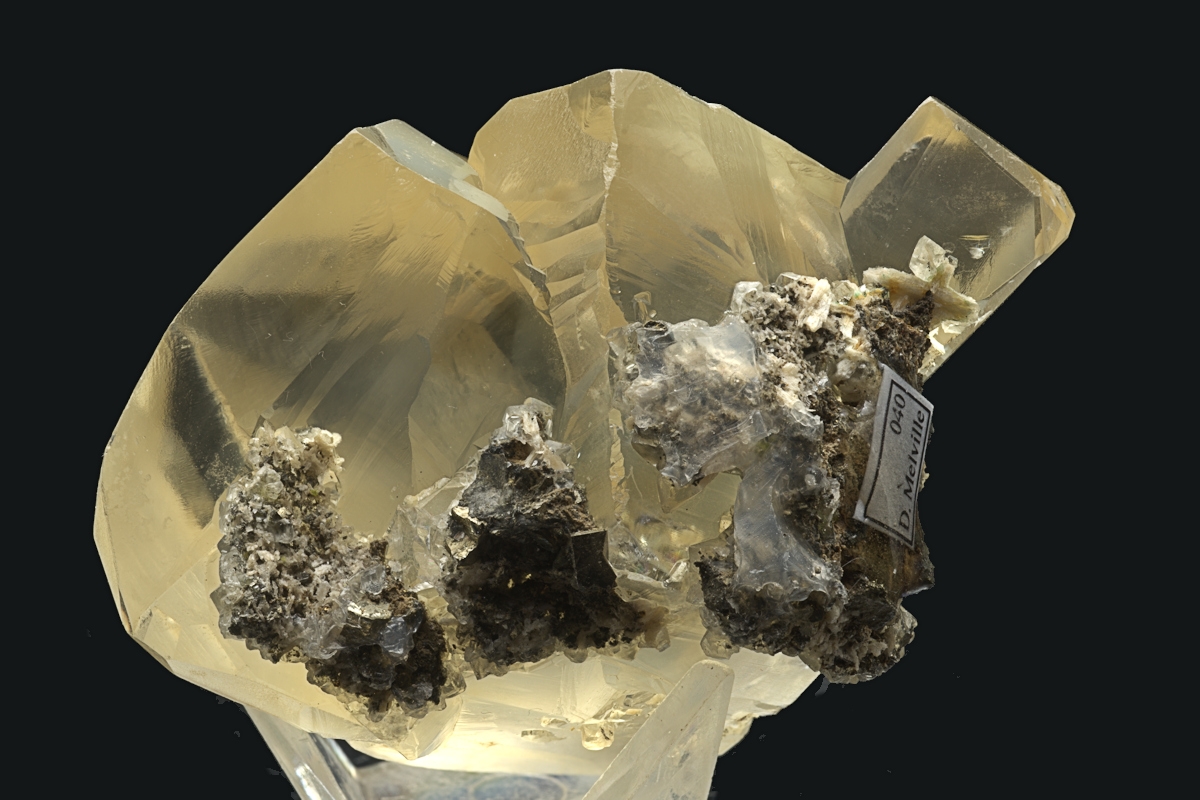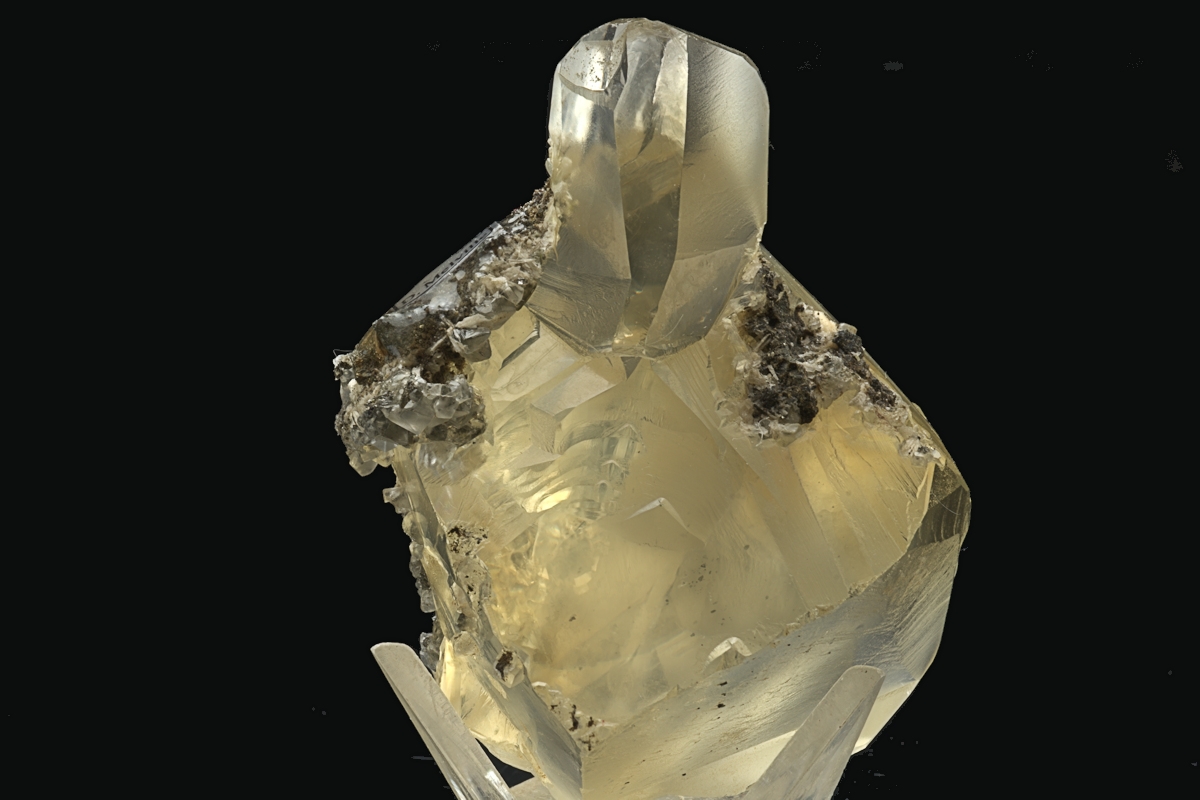 Two transparent honey-yellow calcite crystals showing complex twinning with the addition of a smaller blocky third crystals formed on one of the twins. Small amount of attached matrix on the bottom of the specimen and to one side. Ex. D. Melville collection