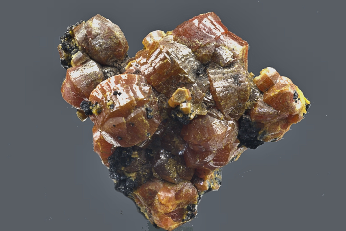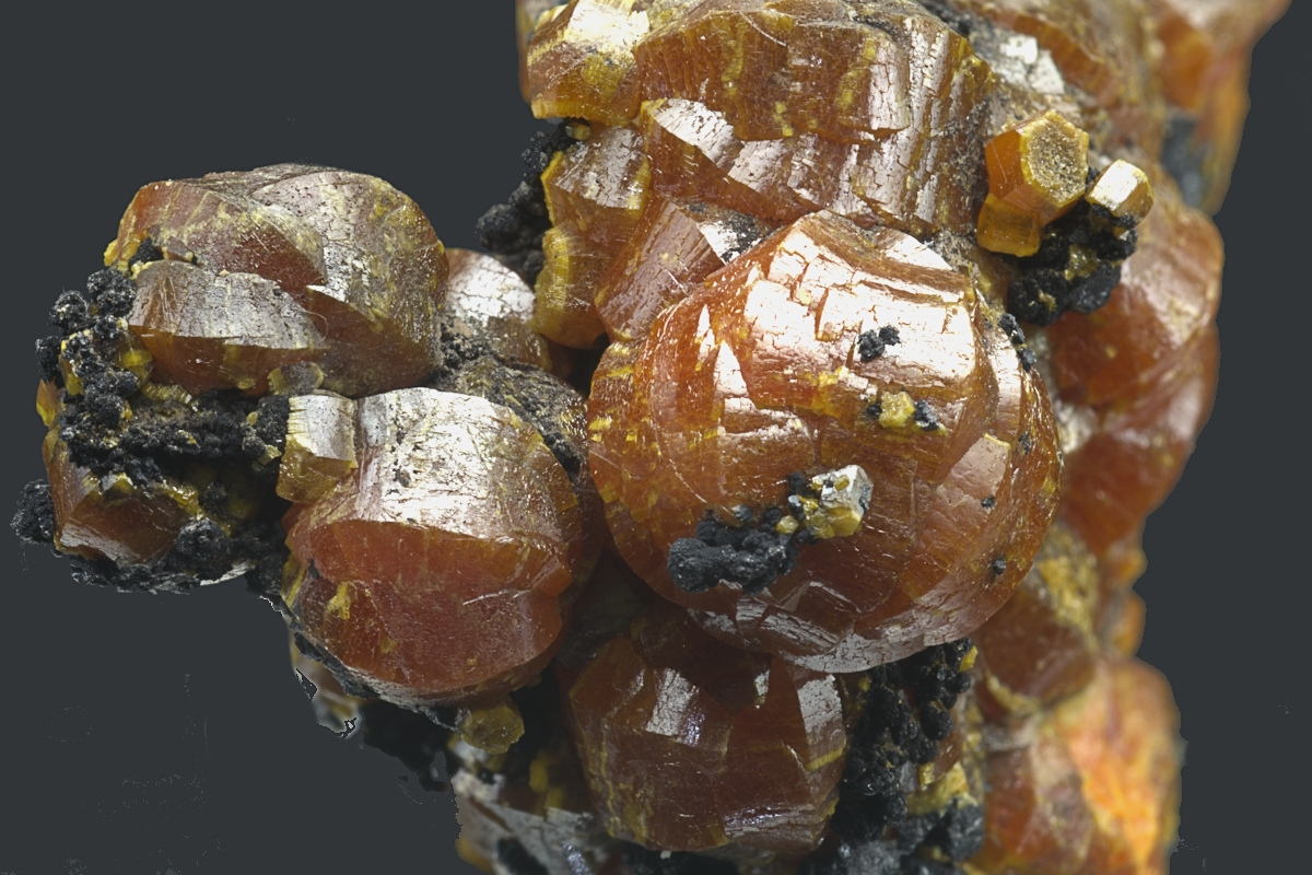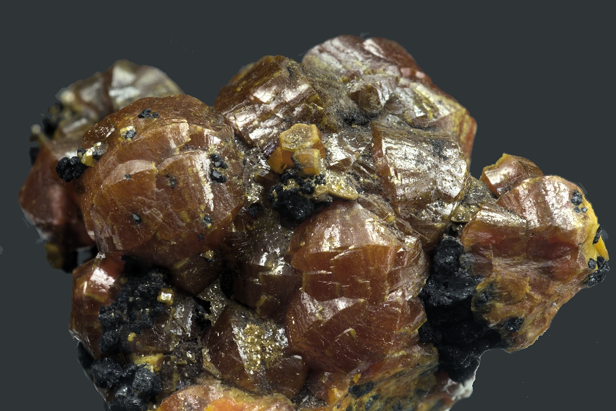 Group of orange-red aggregated Campylite crystals of classic 'Barrel' shaped habit with accompanying black manganese oxide. Ex. David Walker-Barker collection.