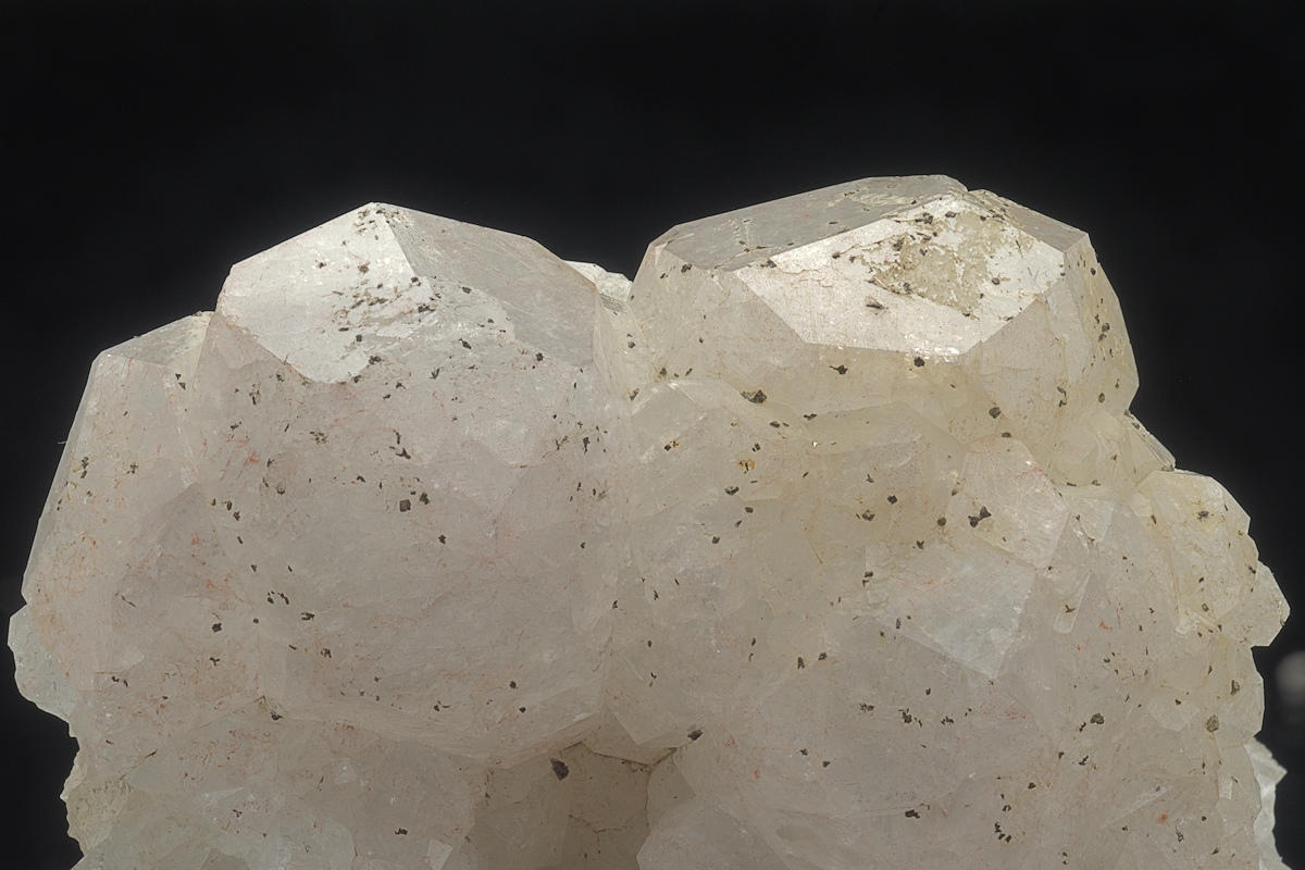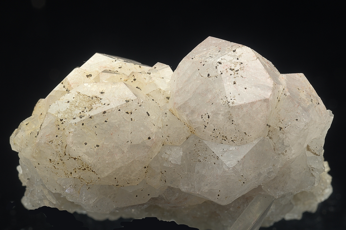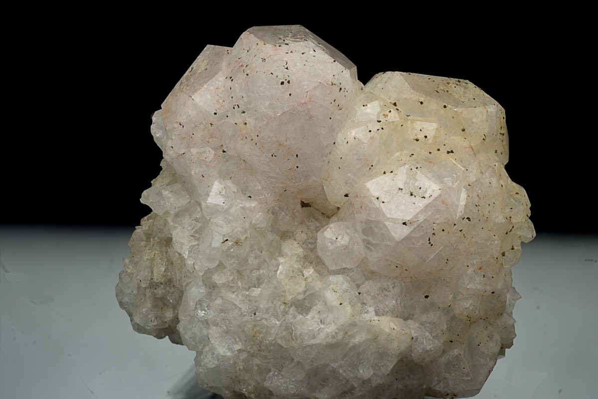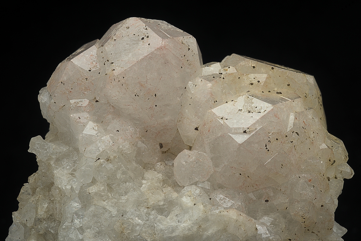 Rich bed of Analcime topped by a group of large white, with a hint of purple, well formed crystals.
