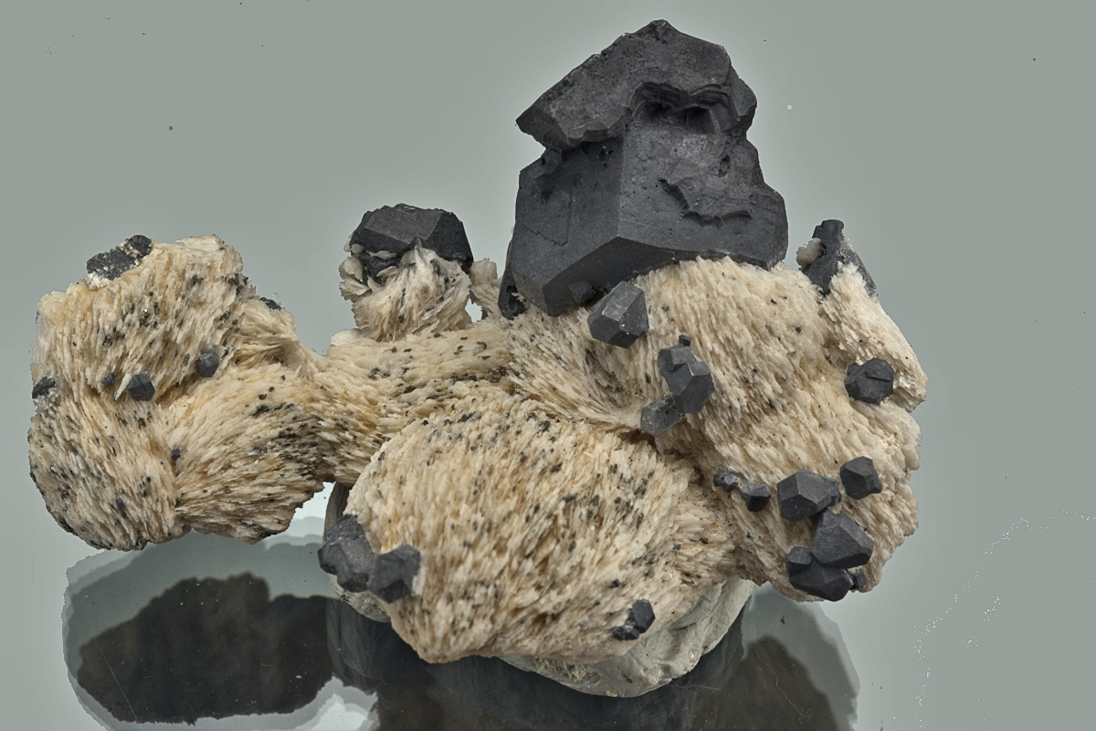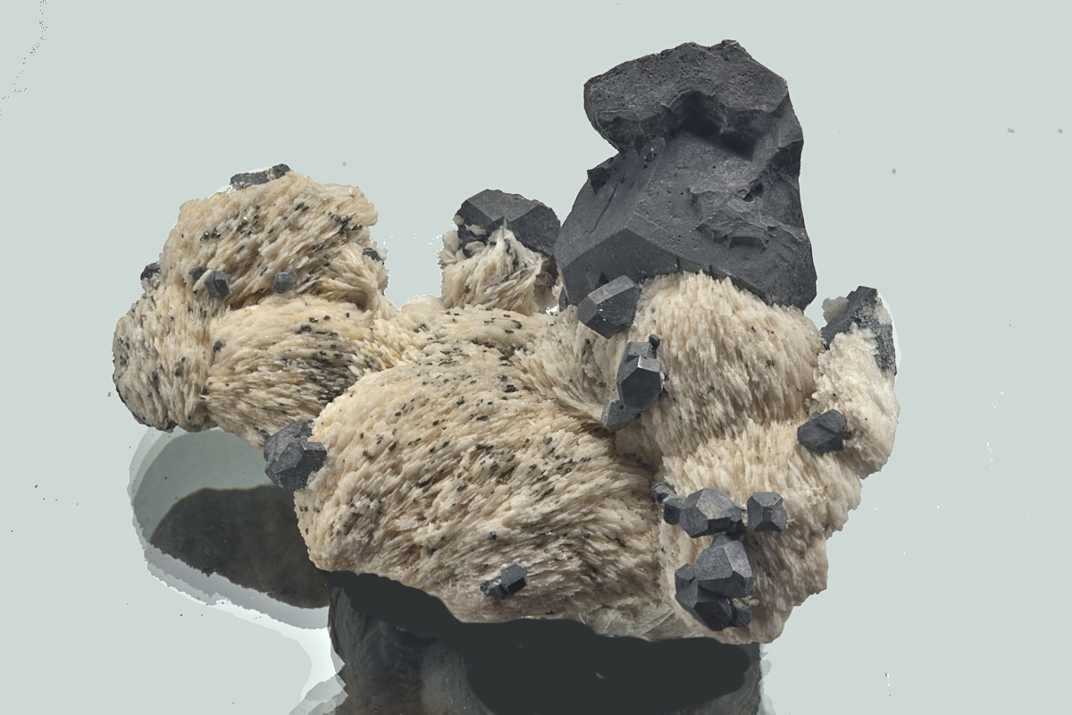 A large modied Galena crystals with a scattering of smaller crystals on a bed of coxscomb Barytes. Crystallised galena is rare at any of the Strontian mines. Etched out of calcite. Ex. David Walker-Barker collection