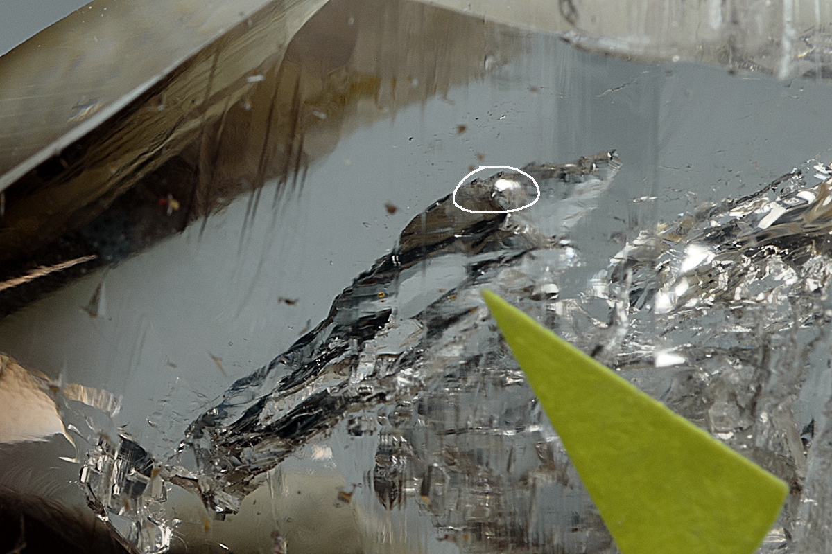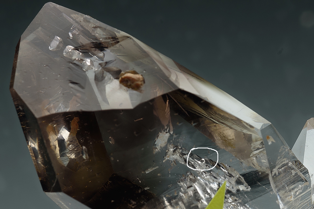 Interesting and attractive stubby stepped, clear to smokey Quartz crystal of exceptional lustre. The interesting part is a moving bubble highlighted in white. Ex. collection of David Walker-Barker.