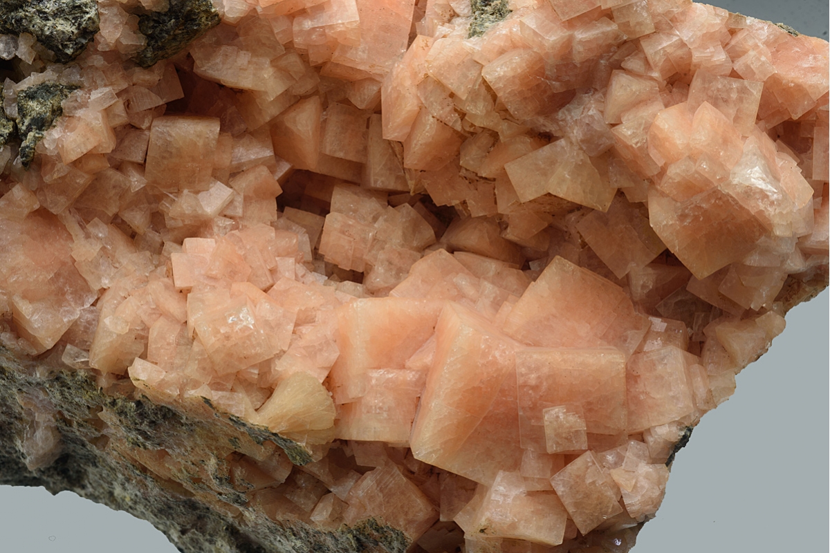 Morocco occasionally produces good zeolite specimens and this display size specimen of Chabazite-Ca) is most impressive. The crystals, up to 16mm across of a rich orange colour, extend across most of the display face and part way around the back.