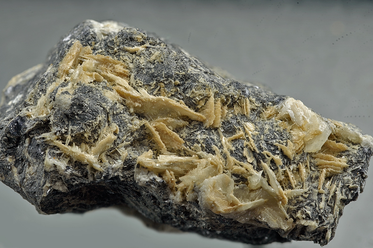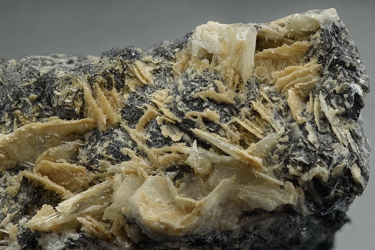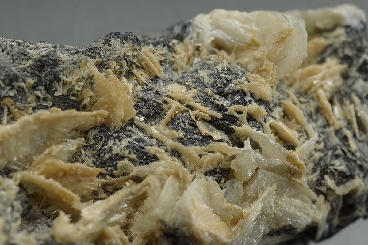 In the 1980's an unusual lead and vanadium deposit was discovered in N.E. Derbyshire. This specimen has cream to brown laminar hydrocerussite crystals richly covering the galena matrix. Ex. P. Briscoe collection. For further details of this mineral occurrence see the Journal of the Russell Society, Volume 24, 2021.