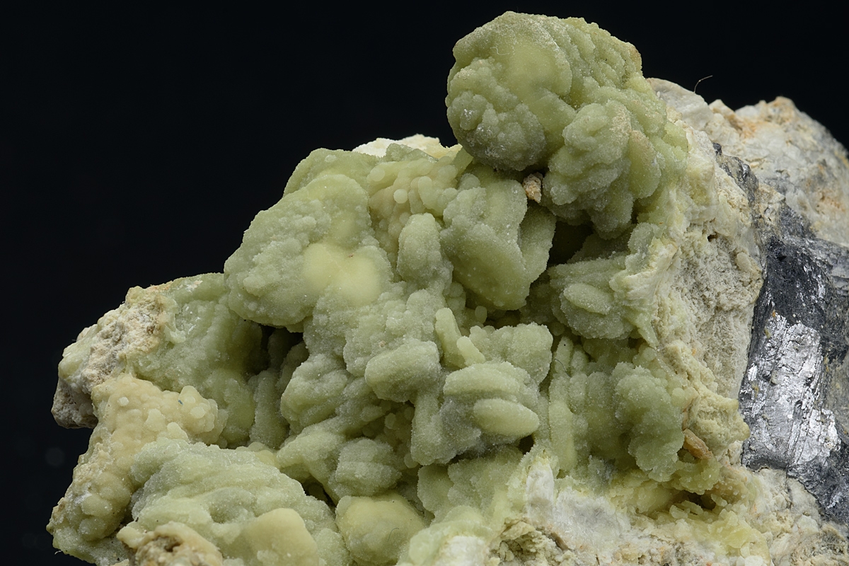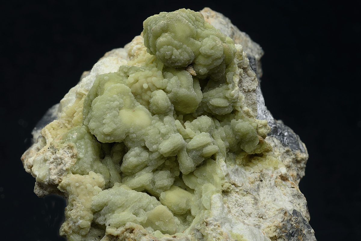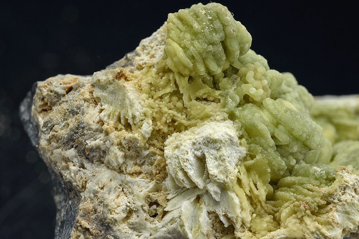 In the 1980's an unusual lead and vanadium deposit was discovered in north east Derbyshire. Excellent specimens were found of Phosphohedyphane and on this specimen it is part pseudomorphing Hydrocerussite. Collected in the 1980's ex P. Briscoe collection. For further details of this mineral occurrence see the Journal of the Russell Society, Volume 24, 2021.