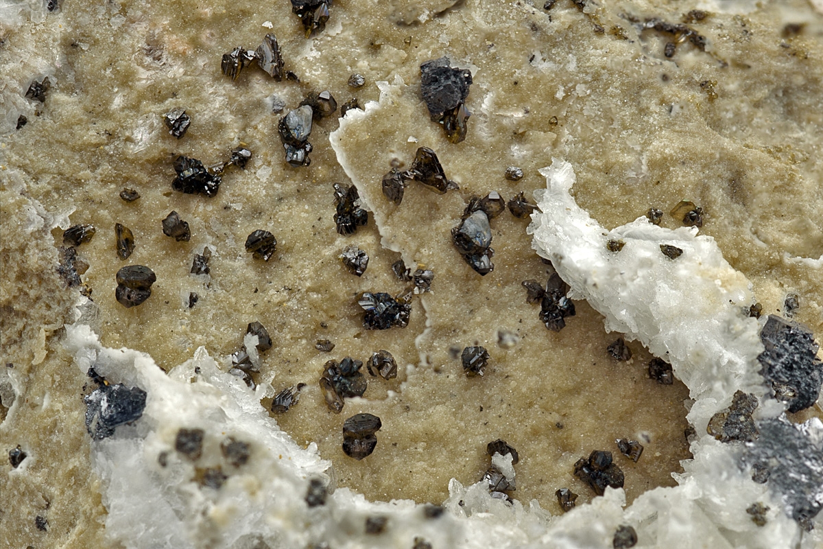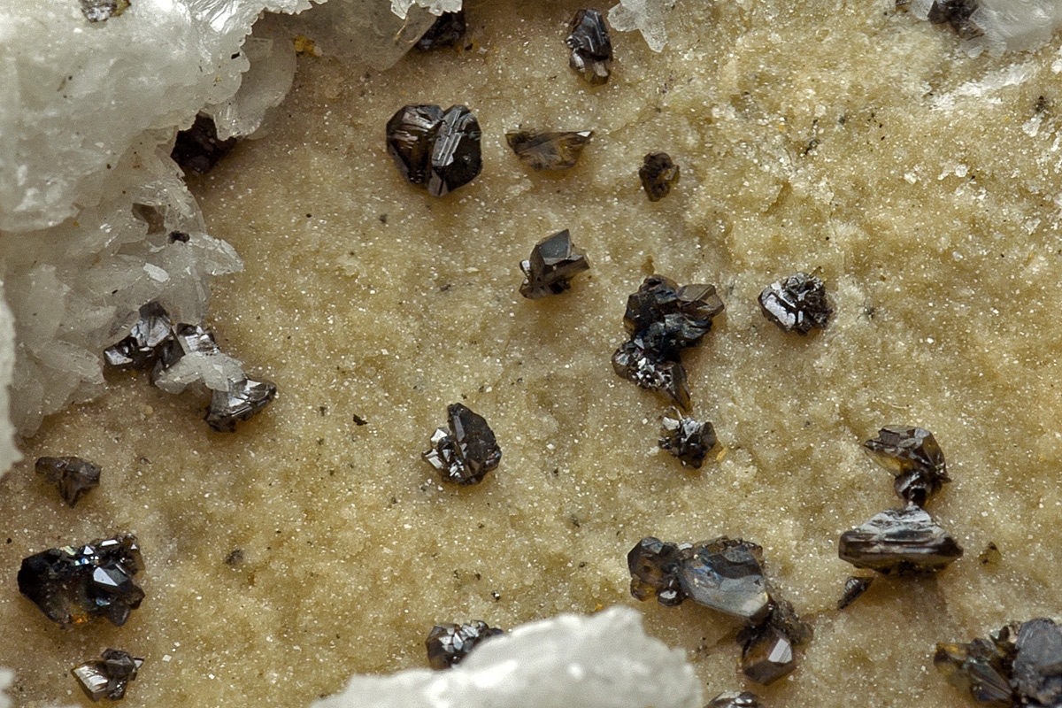 In the 1980's an unusual lead and vanadium deposit was discovered in N.E. Derbyshire. Small flats were found at the base of the permian Dolostone that had a quite different mineralisation from the vein, the flat mineralisation consisting of unaltered galena, barytes and small transparent to transulcent crystals of sphalerite. This specimen shows the form of sphalerite crystallisation associated with galena cubes some embedded in barytes. Ex P. Briscoe collection. For further details of this mineral occurrence see the Journal of the Russell Society, Volume 24, 2021.