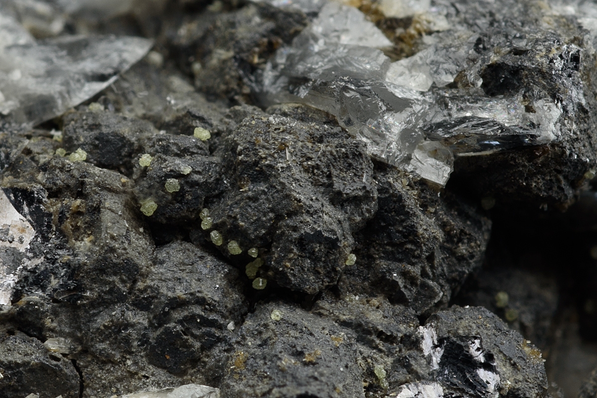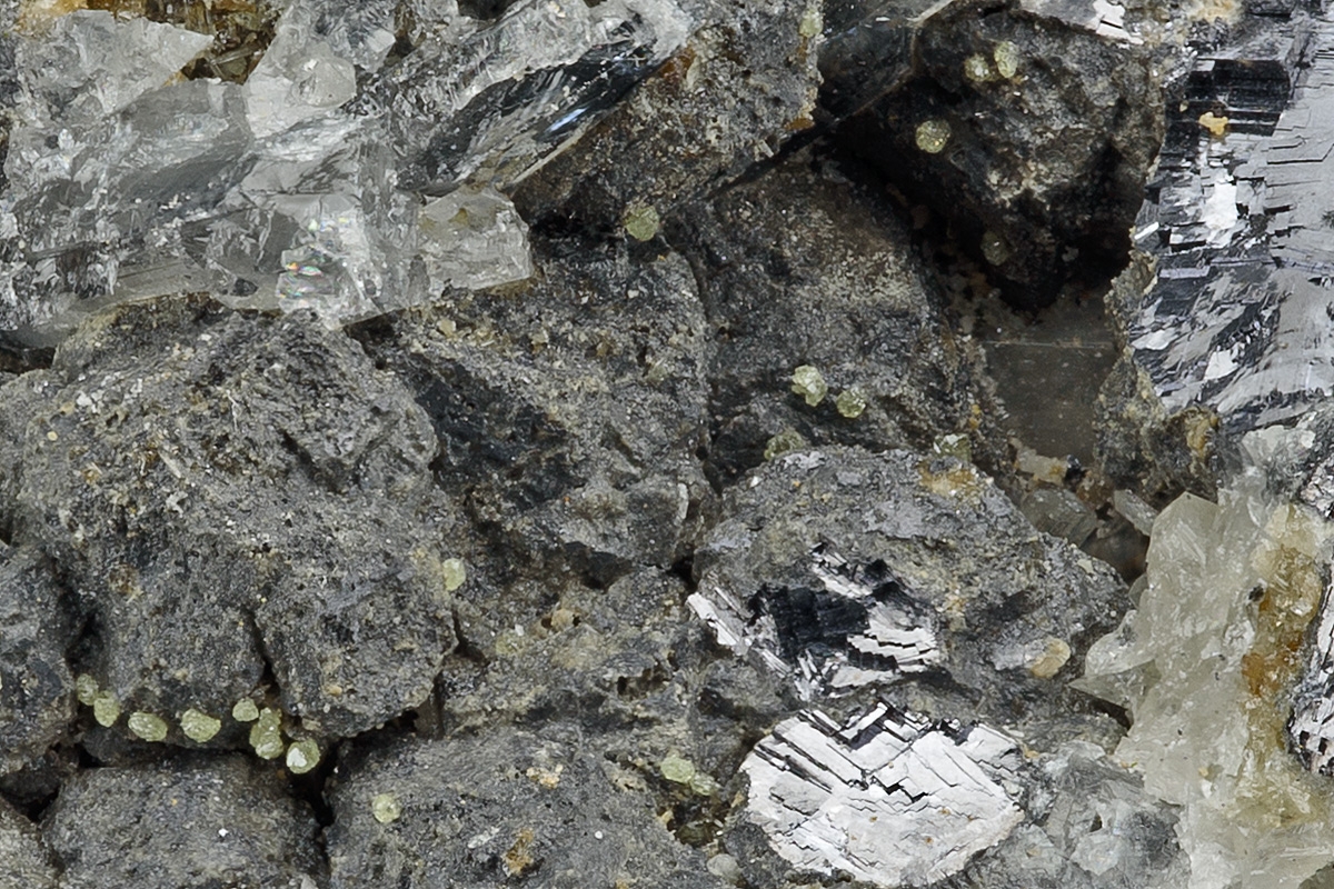 In the 1980's a lead and vanadium deposit was discovered in N.E. Derbyshire. This specimen hosts a small cavity lined with galena crystals on which small (less than 1mm), sharp crystals of sulphur have formed. Ex P. Briscoe collection. For further details of this mineral occurrence see the Journal of the Russell Society, Volume 24, 2021.