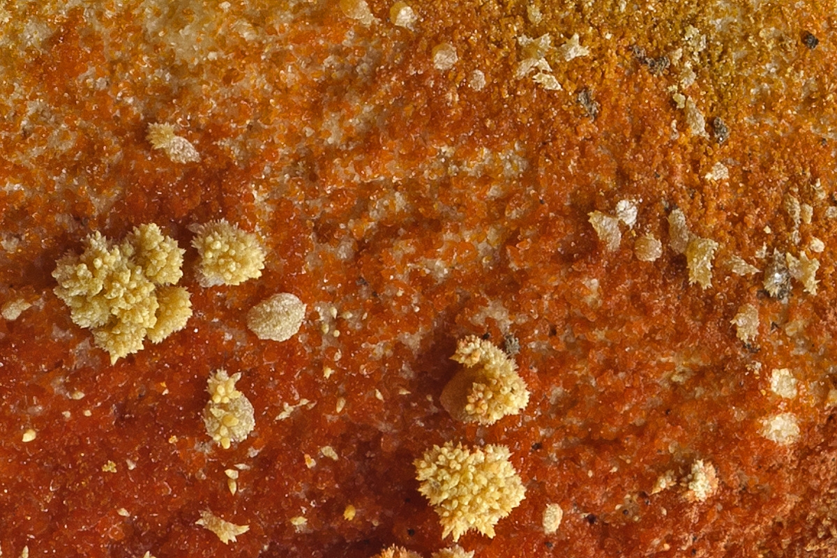 Some of the best Vanadinites and Descloizite specimens in England have come from Whitwell quarry in Derbyshire. This specimen has both barrel shaped and dendritic forms of vanadinite crystals formed over bright red to orange euhedral descloizite. Collected in 1987, Ex. P. Briscoe collection. For further details of this mineral occurrence see the Journal of the Russell Society, Volume 24, 2021.