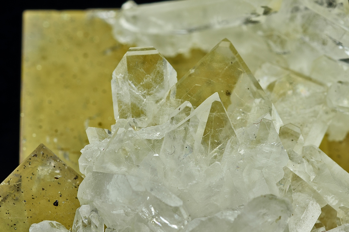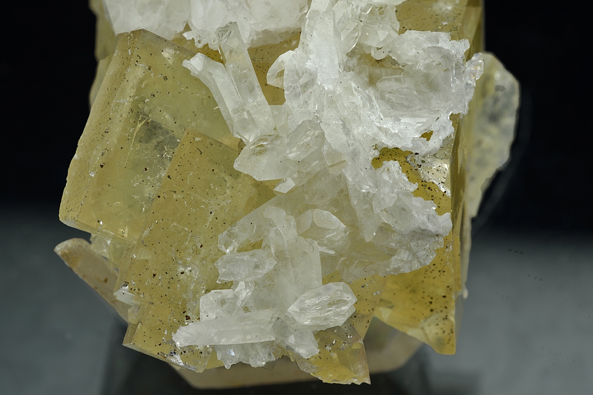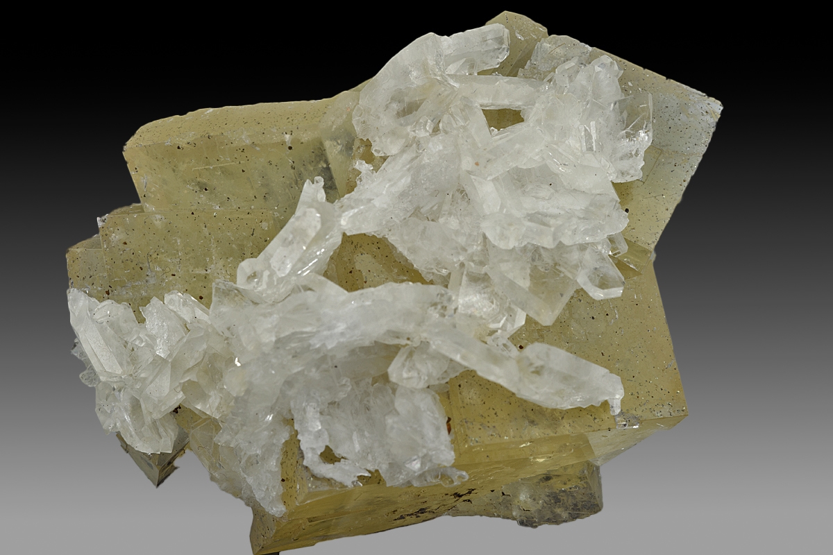 Water clear sharp barytes crystals part coating a group of interlocking fluorite crystals from this famous Wensleydale mine.