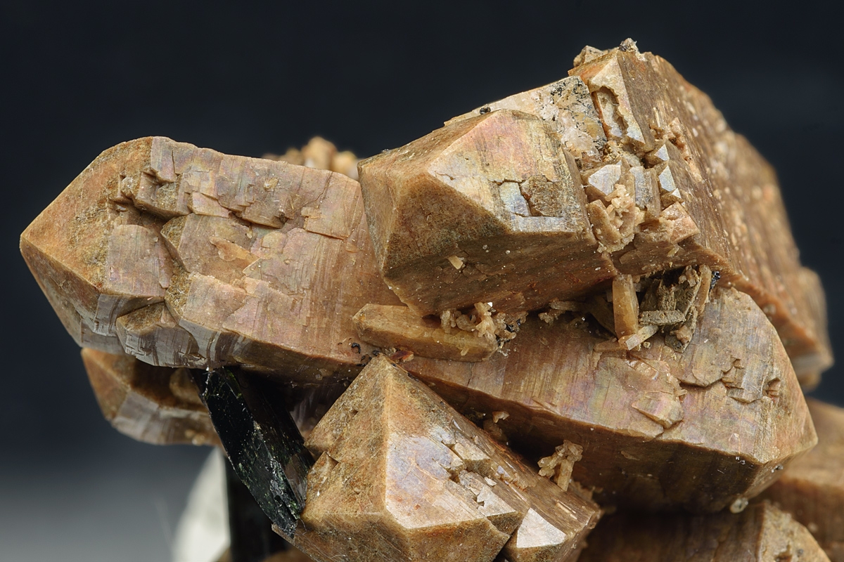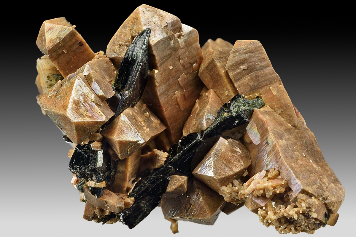 A choice group of interlocking zircon crystals including a a 27mm double terminated crystal all associated with a little aegirine.