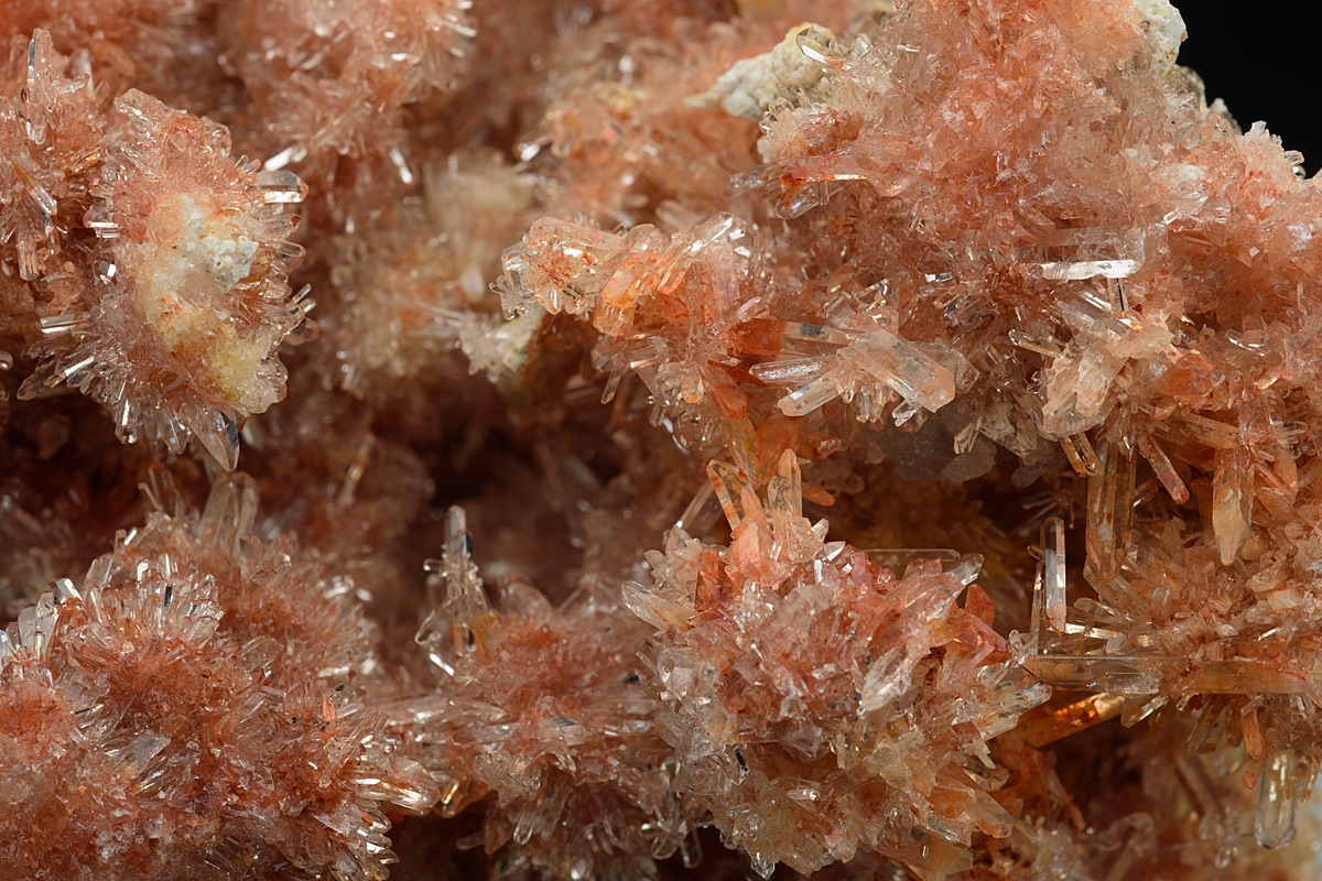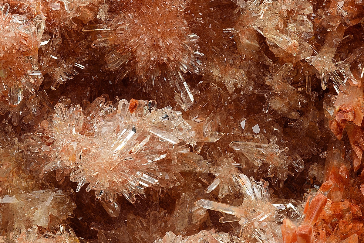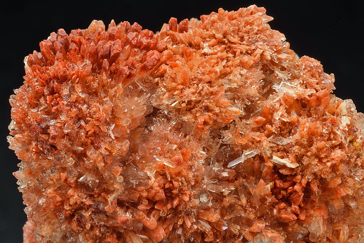 All round coverage of lustrous clear to orange-red gemmy Creedite crystals from this classic location for the species.