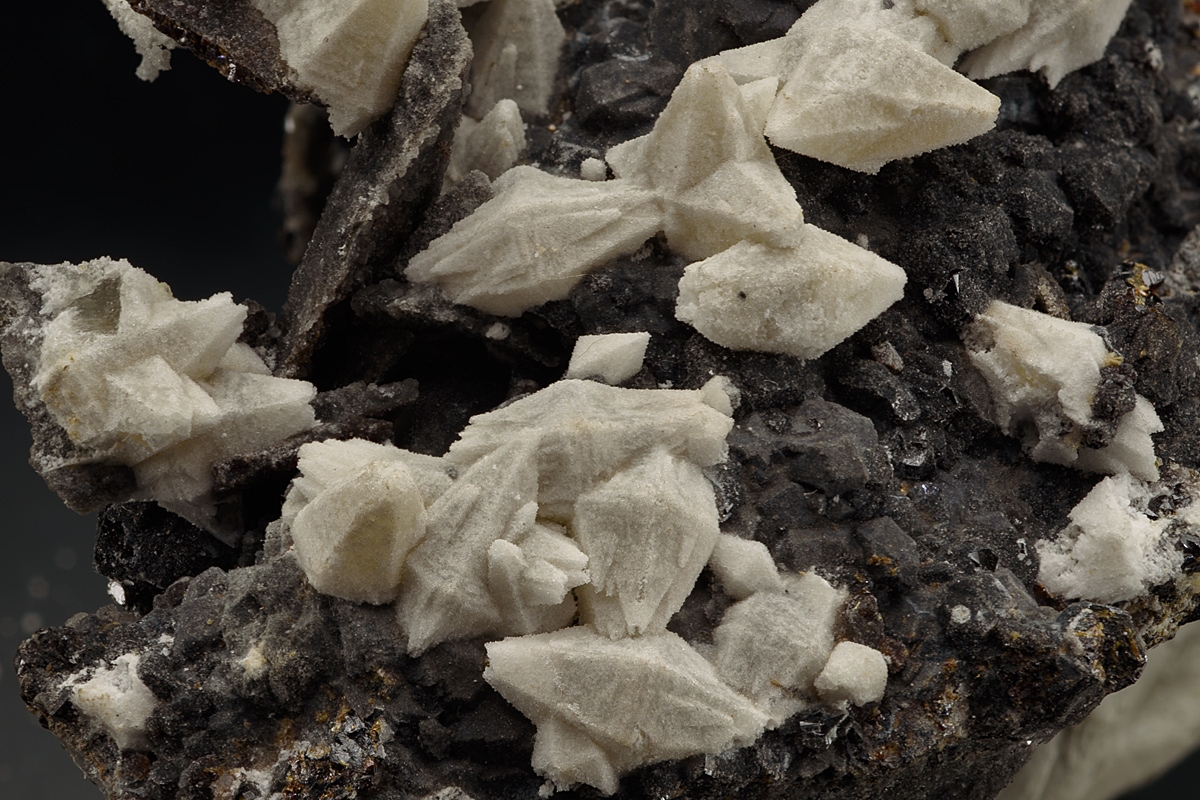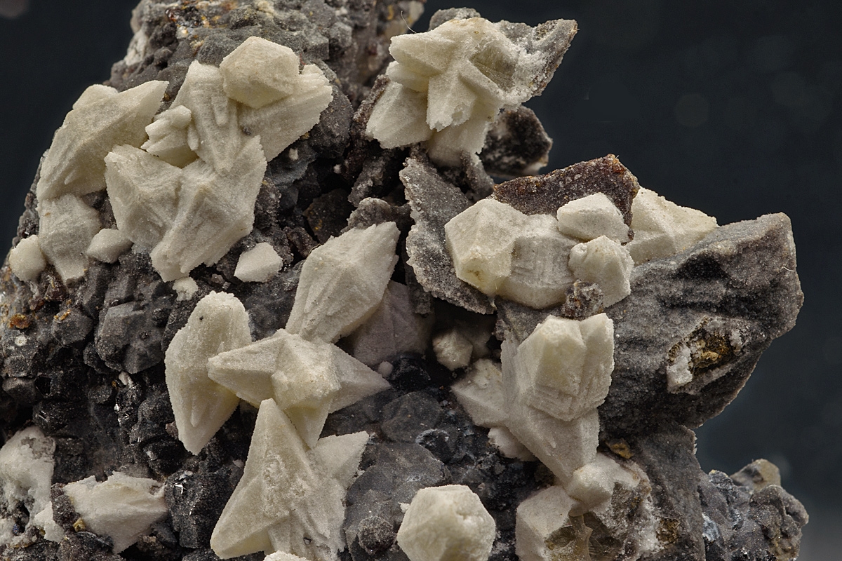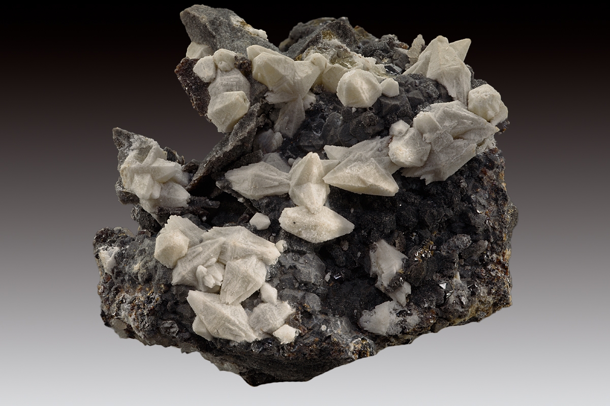 A fine specimen from the 1991 find of Alstonite crystals replaced by Barite. The matt white barite has faithfully retained the original pseudo-hexagonal habit of the alstonite in crystals up to 8mm, some double-terminated.