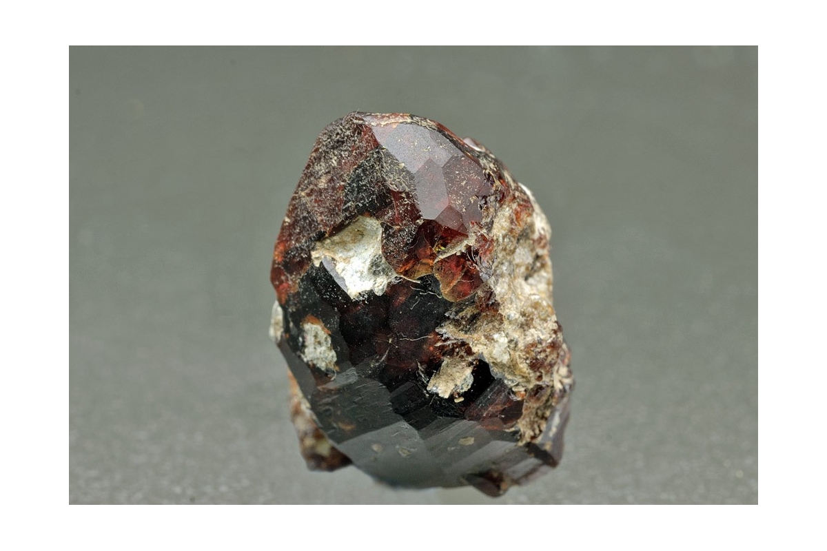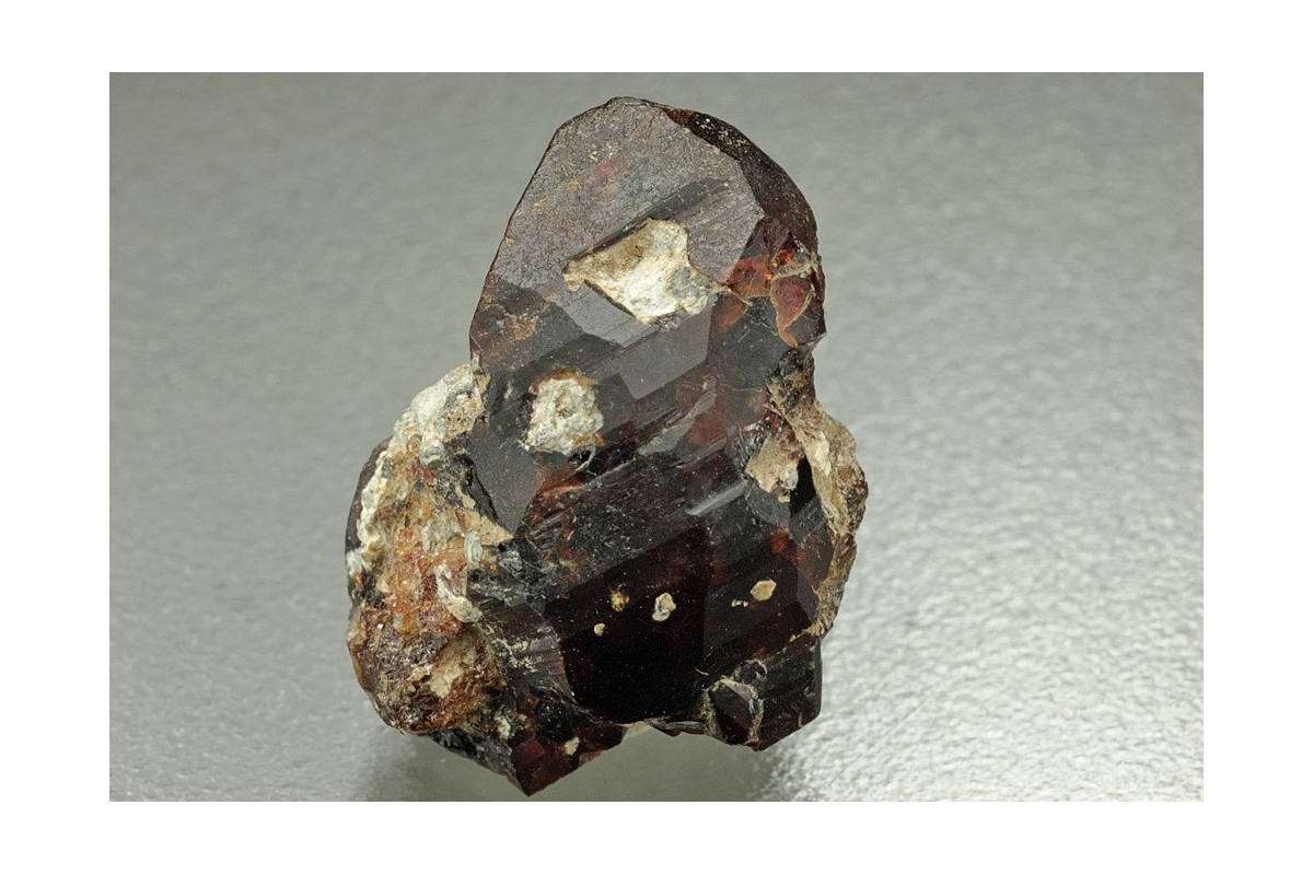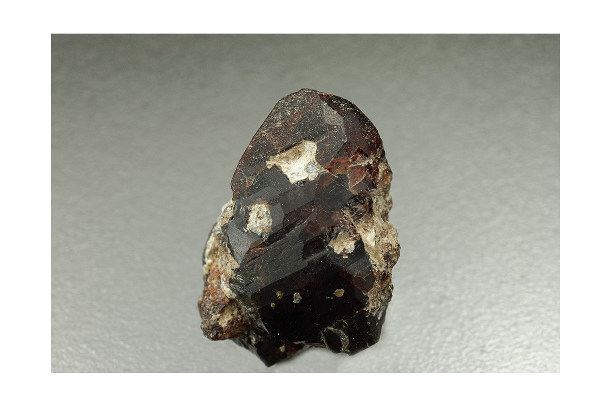 A large crystal of clinohumite, unusual for quite a rare mineral. It has a red-brown colour with a hint of transparency. There is a point of attachment at the back of the crystal but the crystal top is perfectly shaped through 360 degrees.